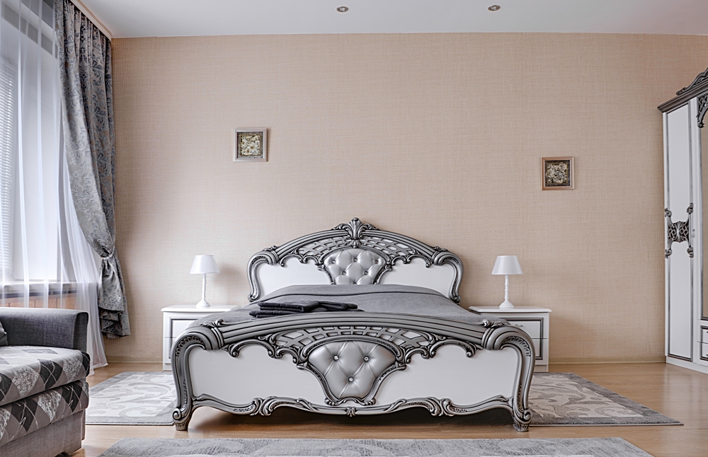 вешалка, диван, зеркало, кровать двуспальная, прикроватные тумбочки, стол, стулья, шкаф