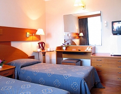 вешалка, зеркало, кровати односпальные, прикроватные тумбочки, стол, столик туалетный, стулья, шкаф