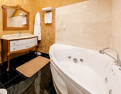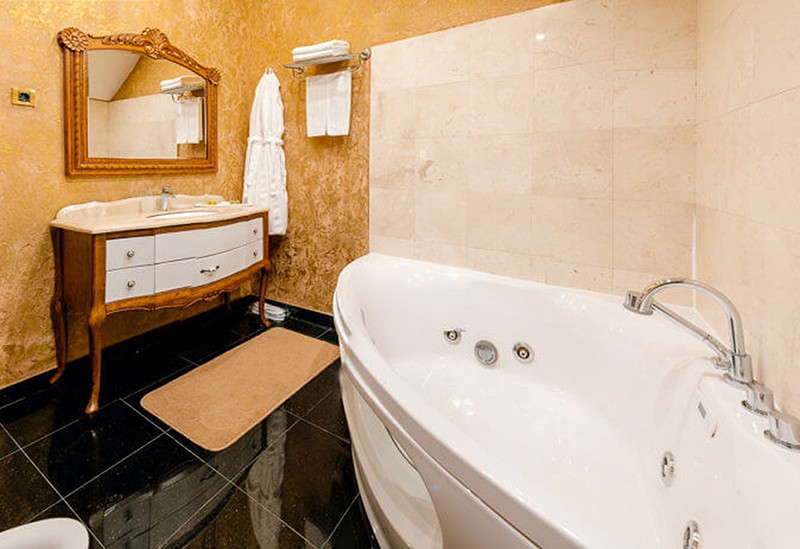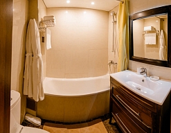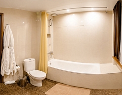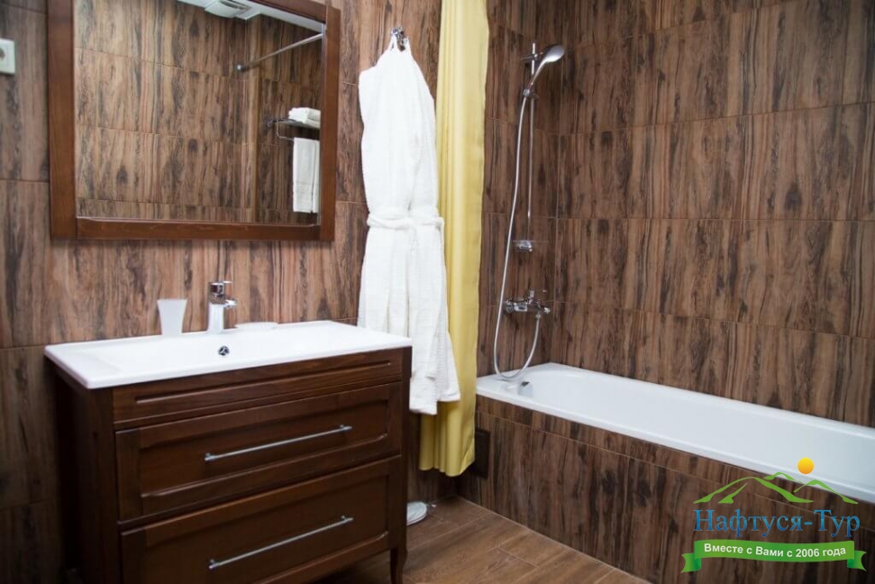 с ванной, тапочки, туалетные принадлежности, фен, халат