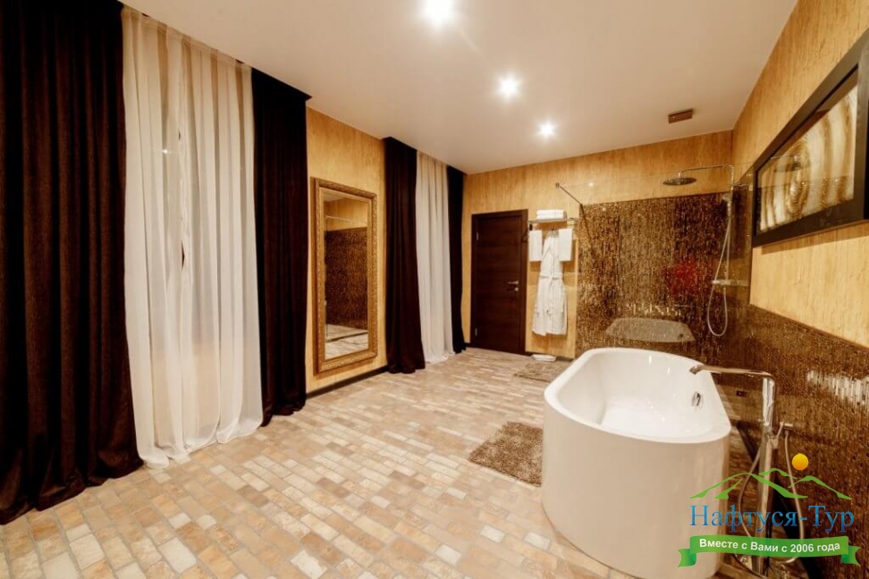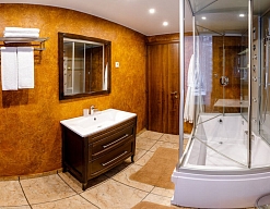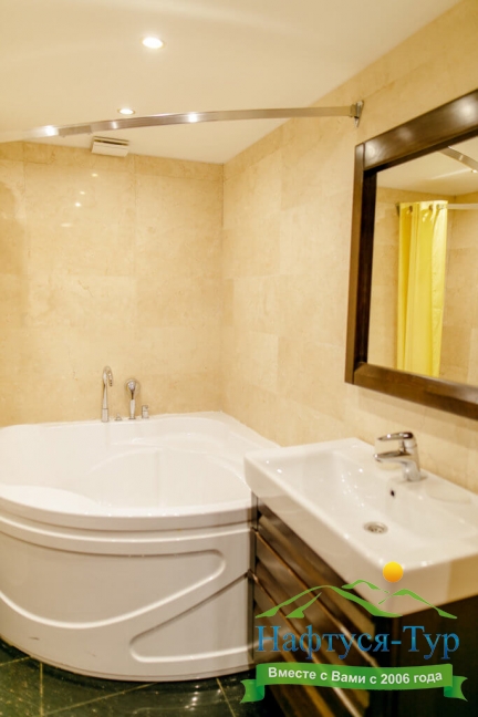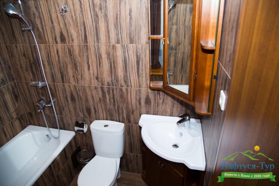 2 санузла, с ванной и душевой кабиной, тапочки, туалетные принадлежности, фен, халат