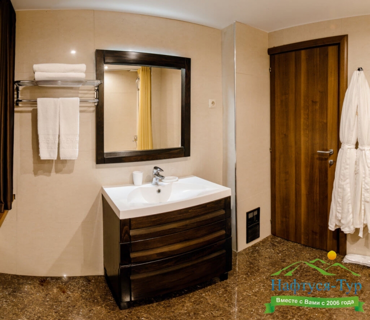 с душем, тапочки, туалетные принадлежности, фен, халат