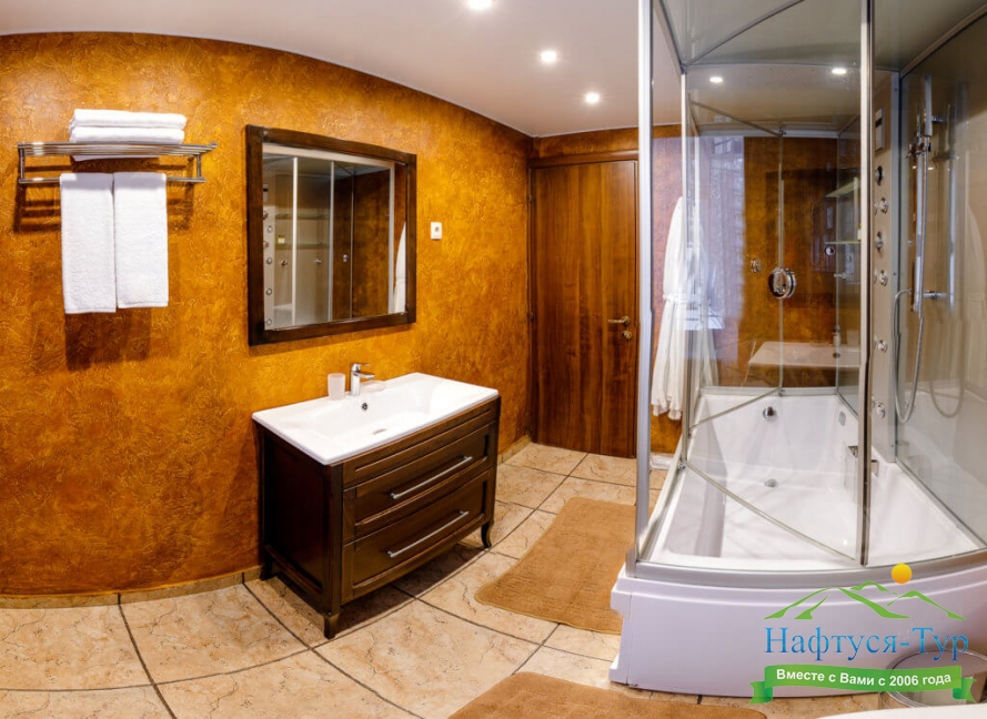 с душевой кабиной, тапочки, туалетные принадлежности, фен, халат
