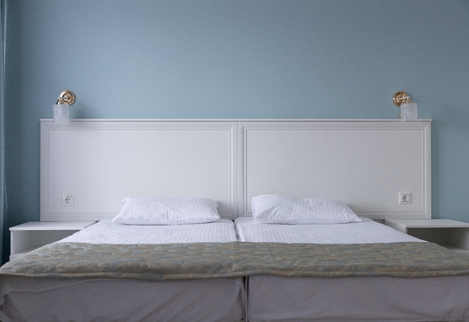 зеркало, кровати односпальные /одна двуспальная кровать, прикроватные тумбочки, стол, стул, шкаф