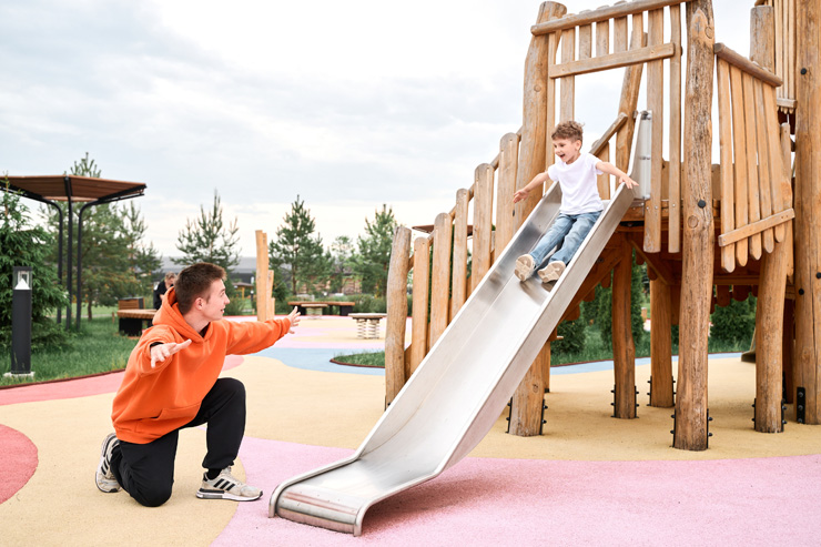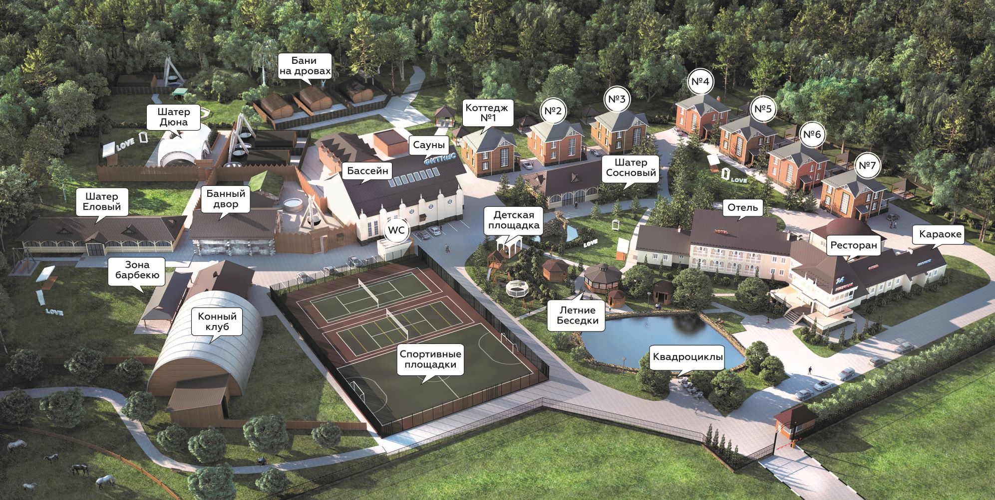 На просторной территории 20 Га с лесопарком расположены множество открытых спортивных площадок, собственный пляж на берегу Москва реки, заповедник с оленями и маралами, пруд для рыбалки – все это и многое другое в окружении потрясающе красивой природы.