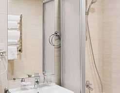 с душевой кабиной, туалетные принадлежности, фен