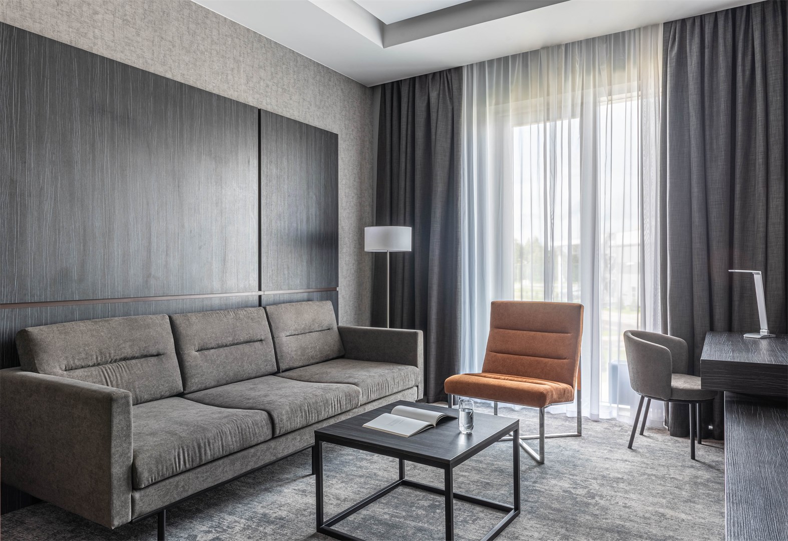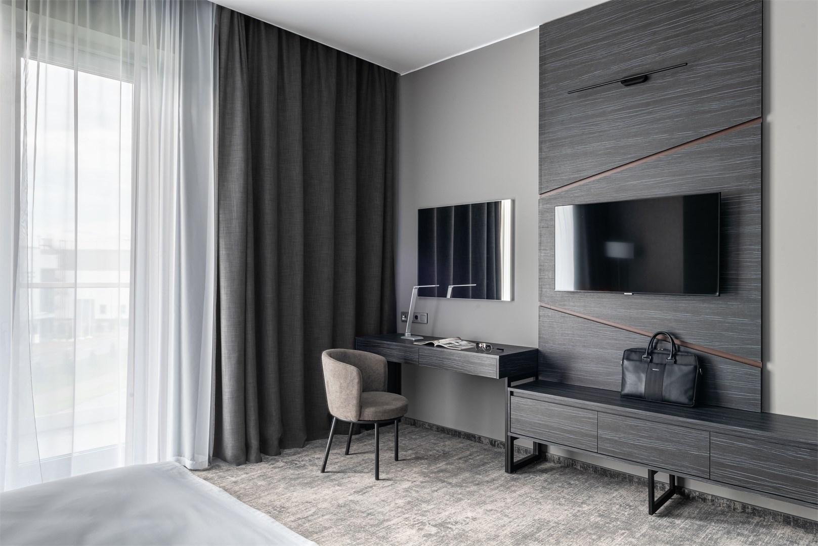 вешалка, зеркало, кресло, кровать двуспальная, прикроватные тумбочки, стол, стул, шкаф