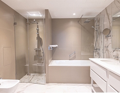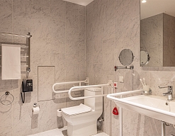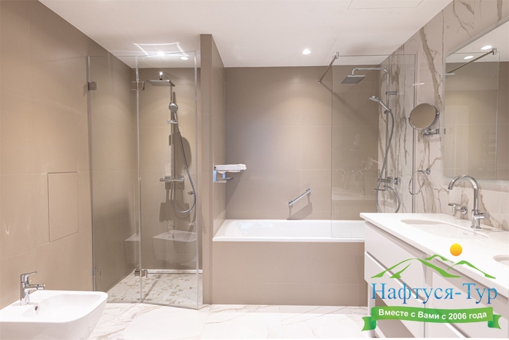 с ванной и душевой кабиной, тапочки, туалетные принадлежности, фен