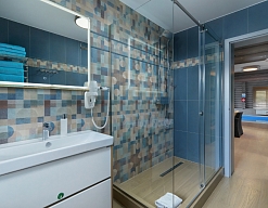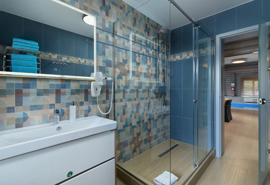 с душевой кабиной, тапочки, туалетные принадлежности, фен