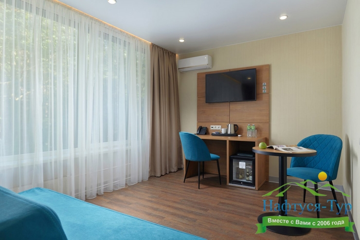 мини-холодильник, сплит-система, телевизор ЖК, телефон, чайный набор посуды