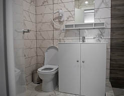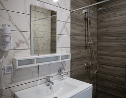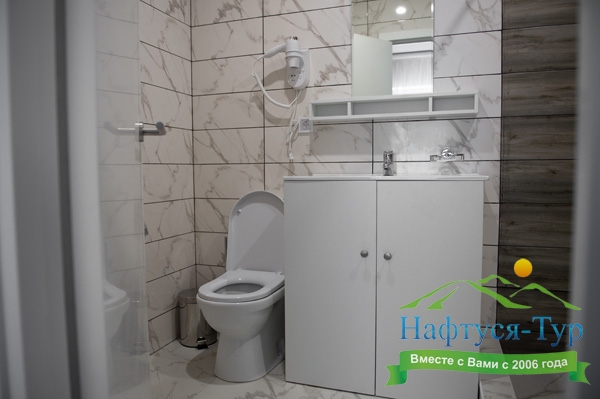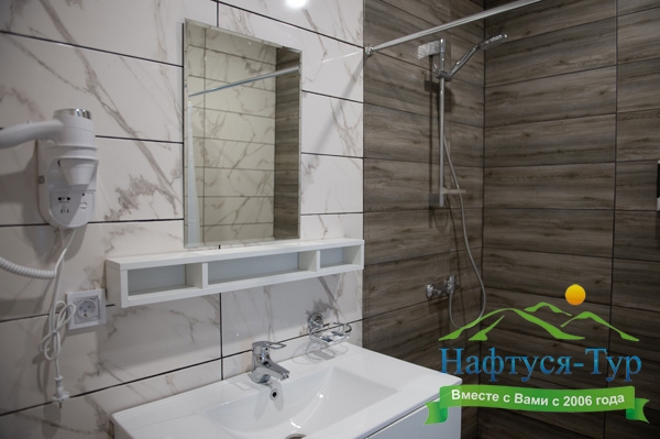 с душем, тапочки, туалетные принадлежности, фен, халат