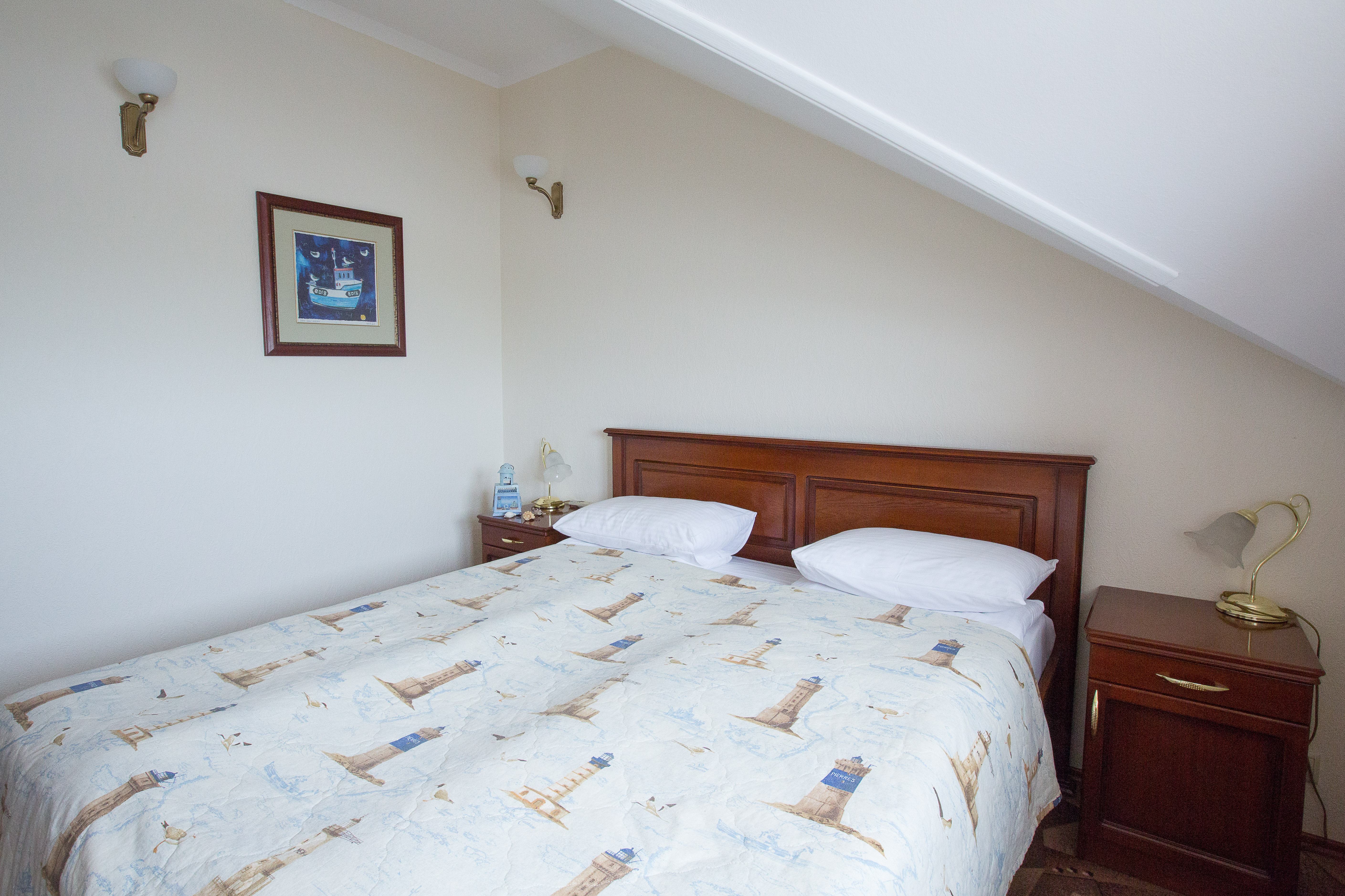 вешалка, зеркало, кровати полутороспальные, прикроватные тумбочки, стол, стулья, шкаф