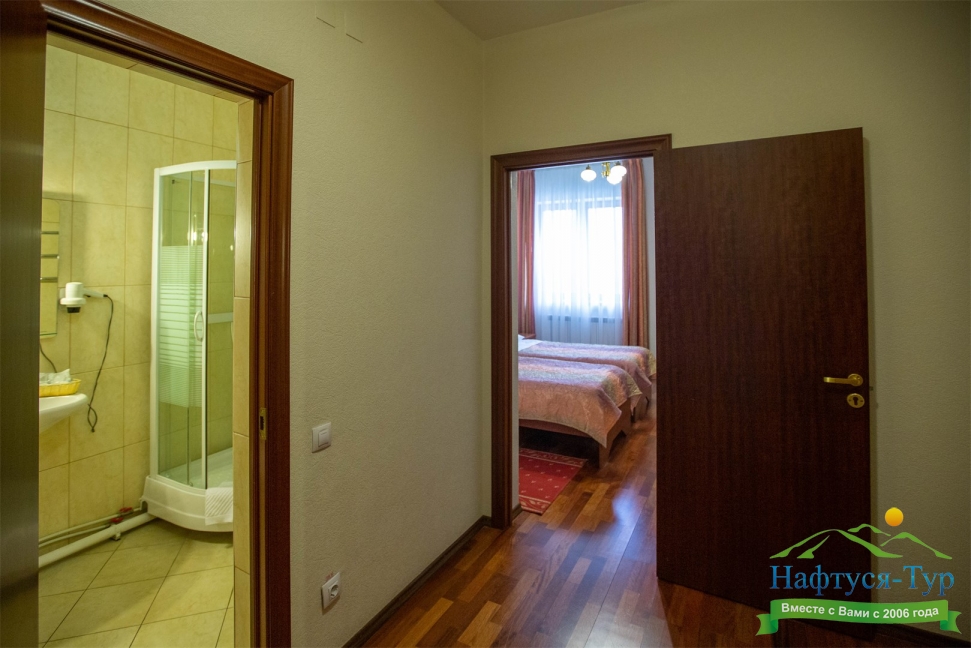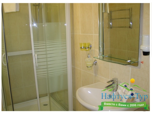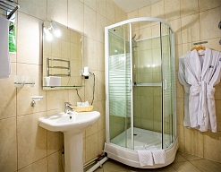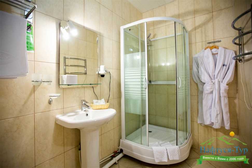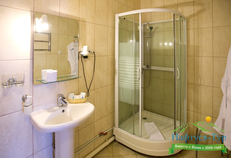 с душевой кабиной, тапочки, туалетные принадлежности, фен