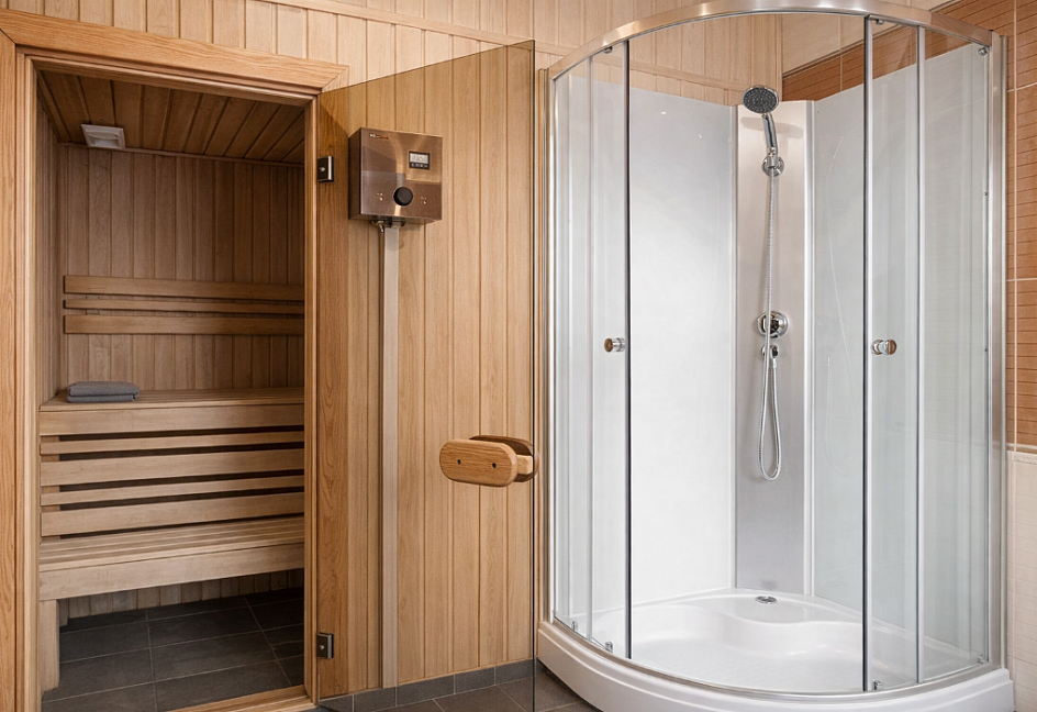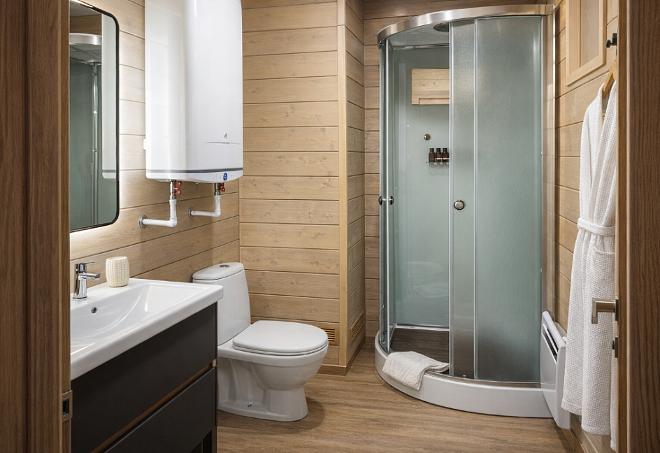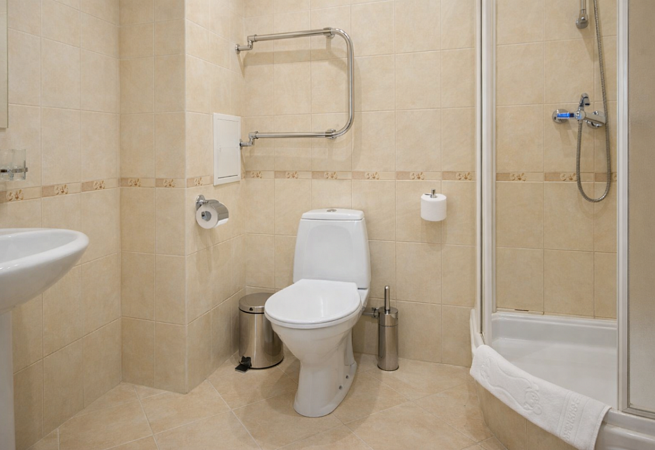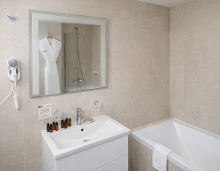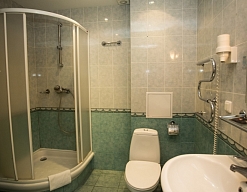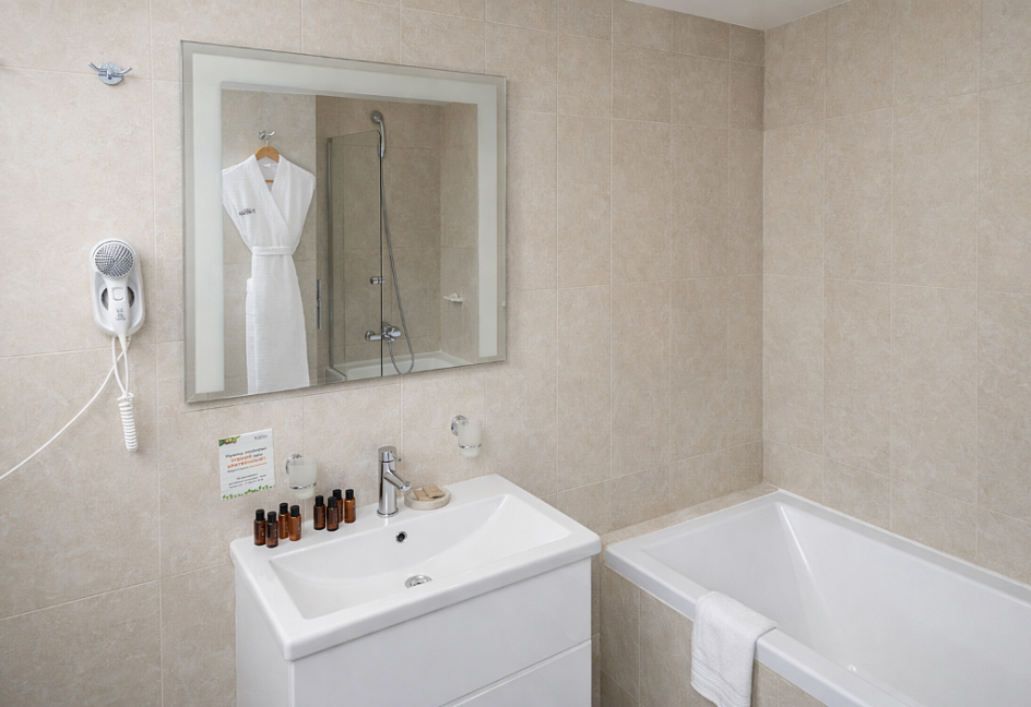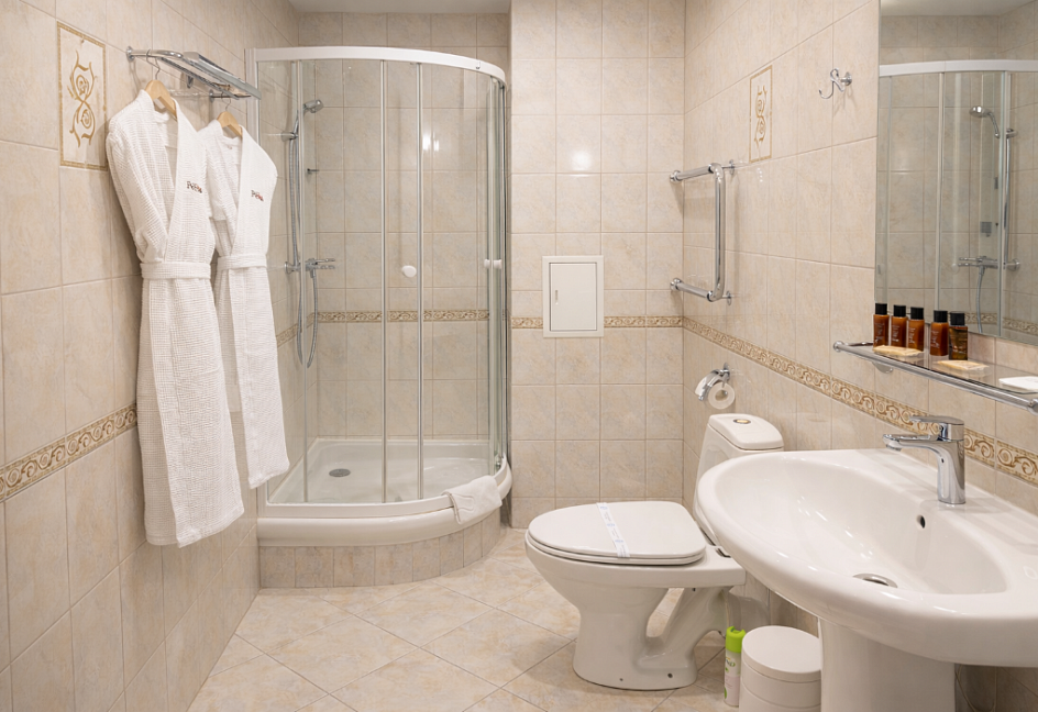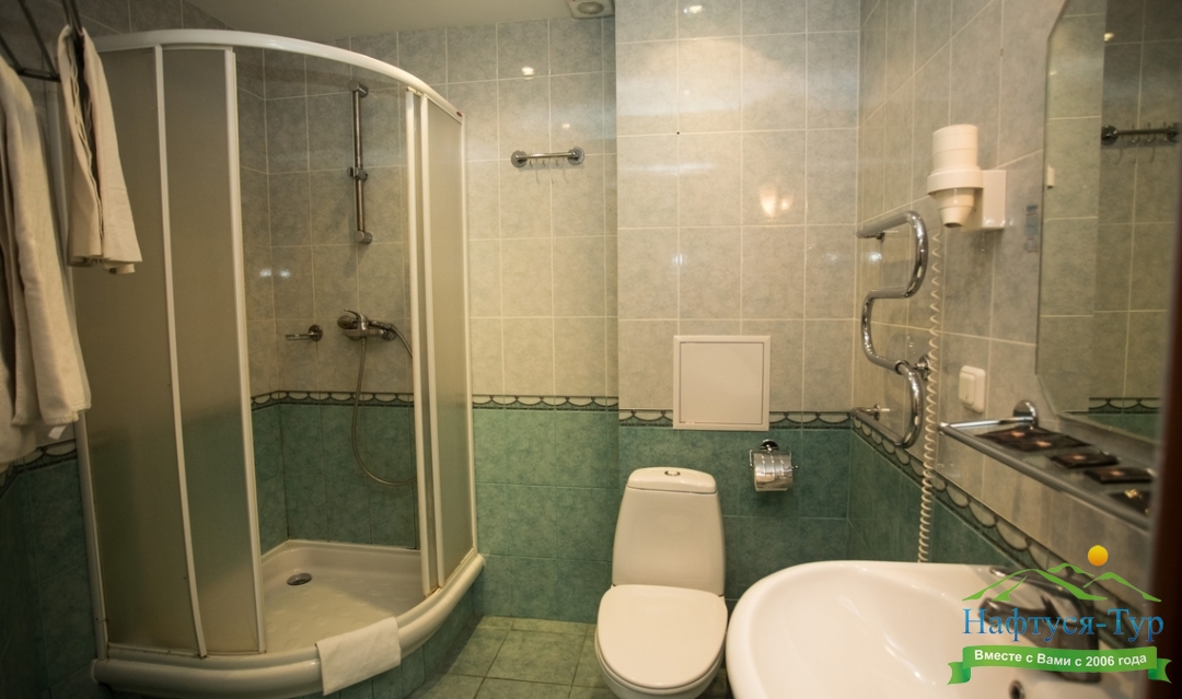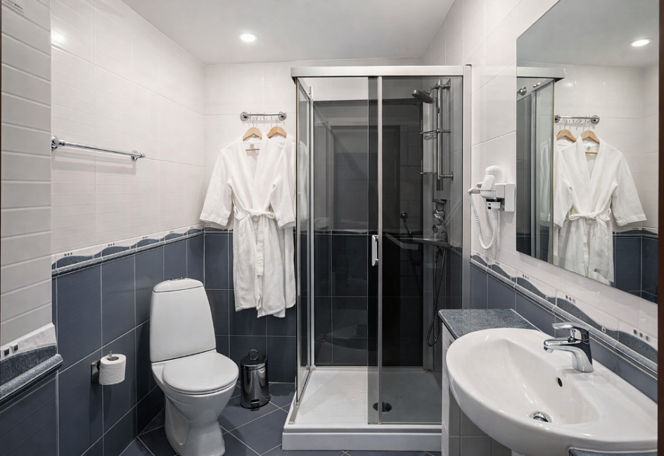 с душевой кабиной, туалетные принадлежности, фен