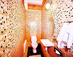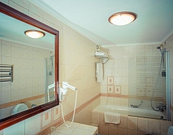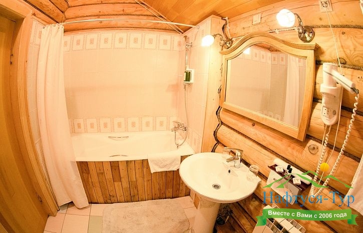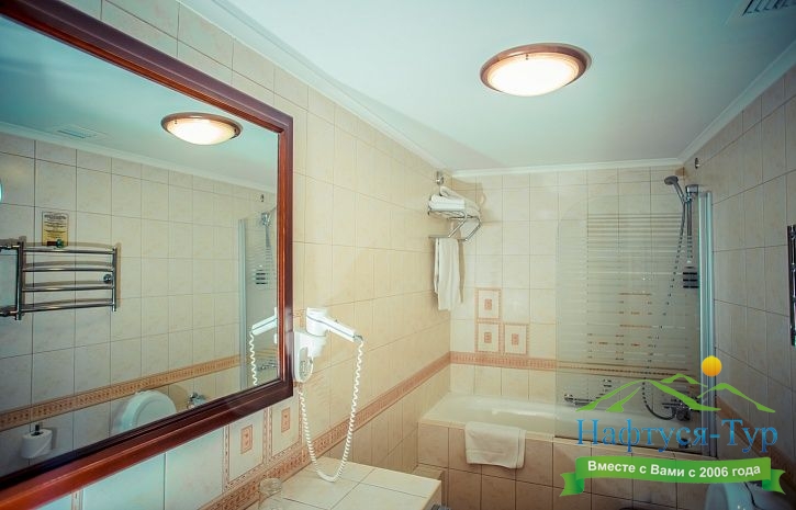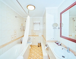 с ванной, с душевой кабиной, тапочки, туалетные принадлежности, фен, халат