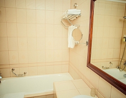 с ванной, тапочки, туалетные принадлежности, фен, халат