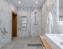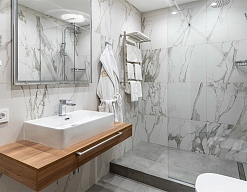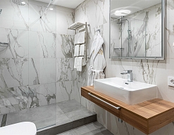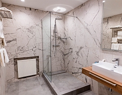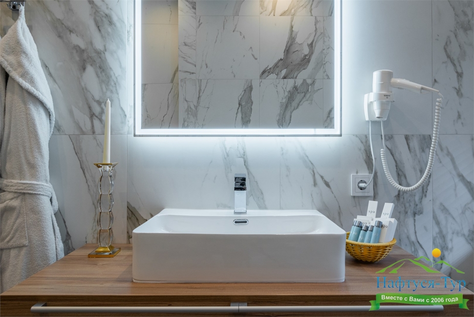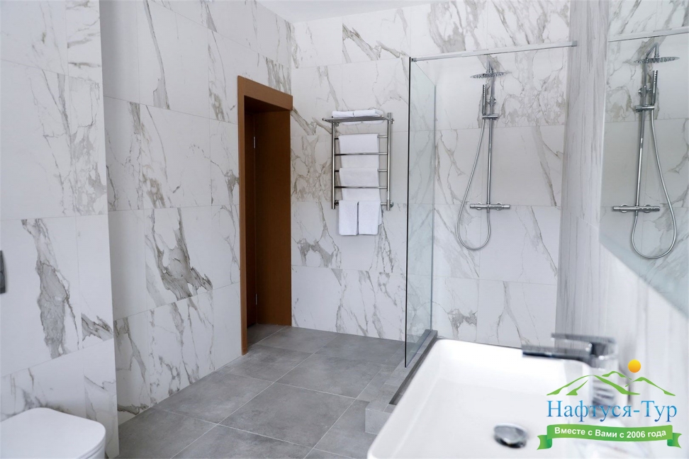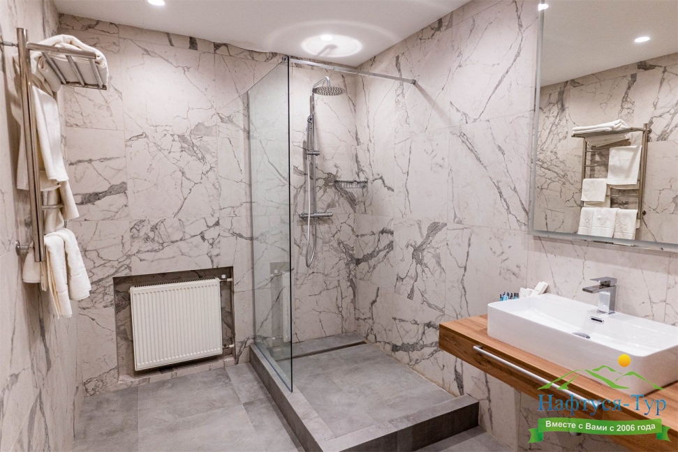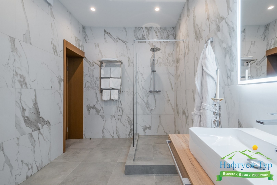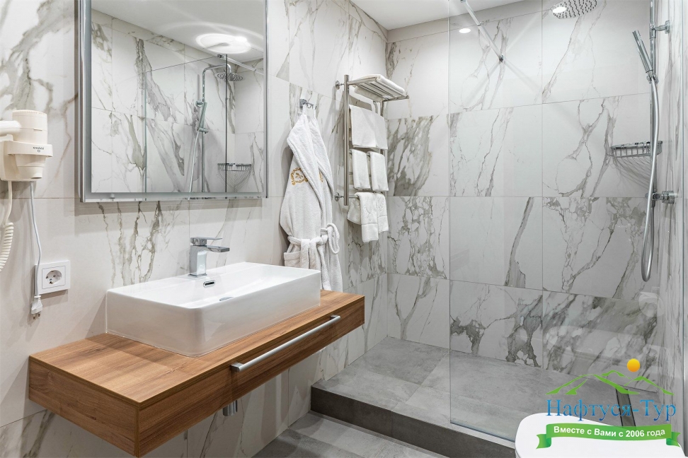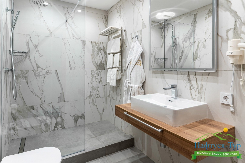 с душевой кабиной, тапочки, туалетные принадлежности, фен, халат