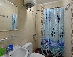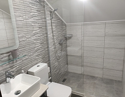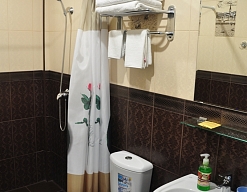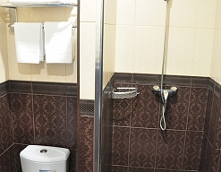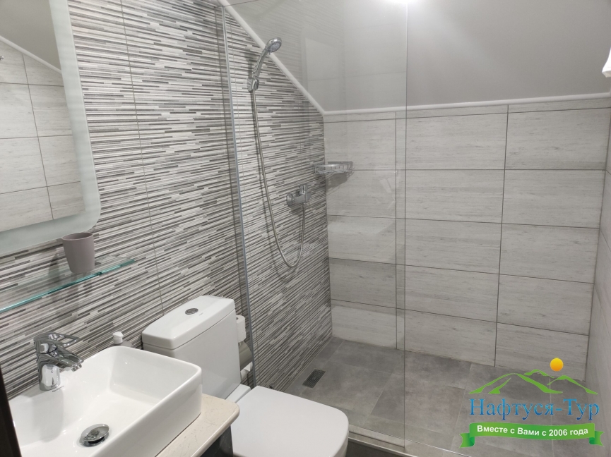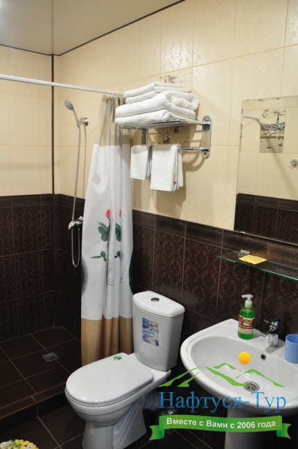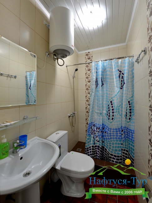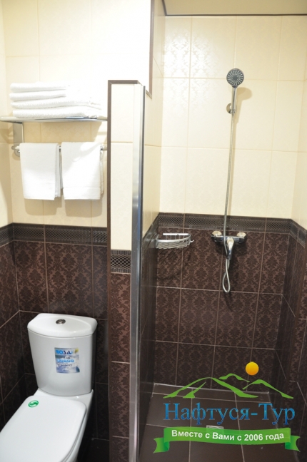 с душем (поддон), тапочки, туалетные принадлежности, фен