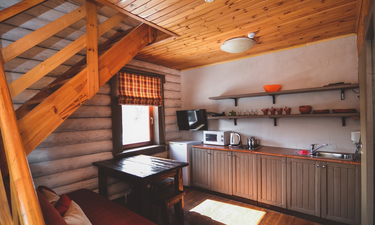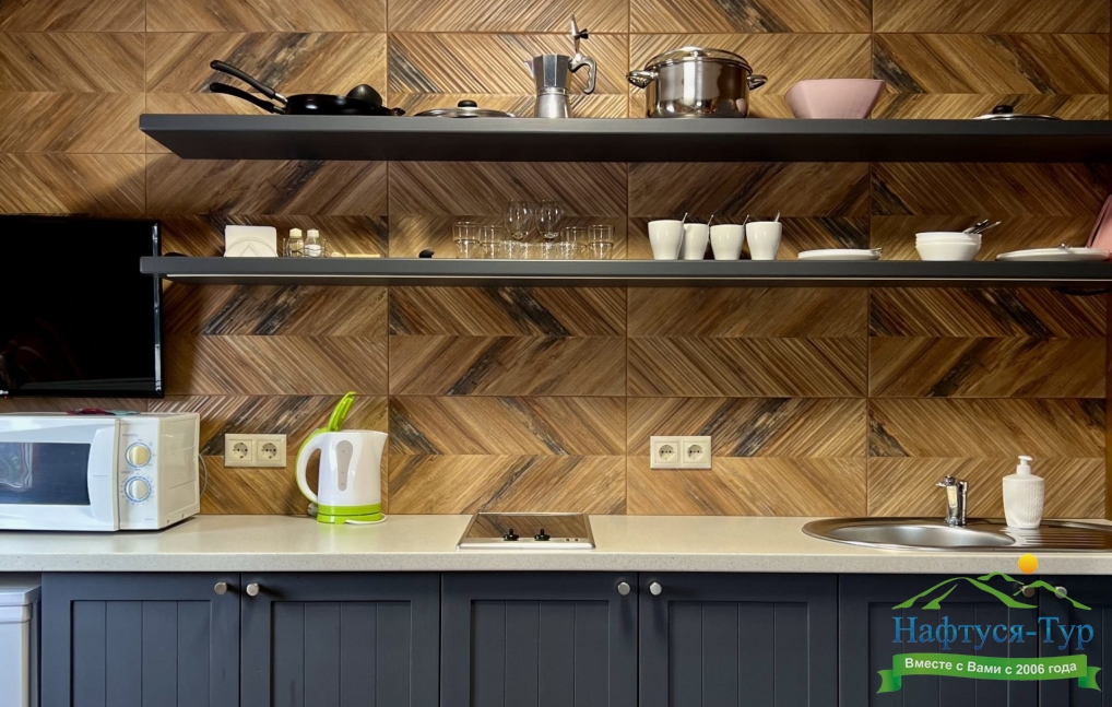 микроволновая печь, телевизор ЖК, холодильник, чайный набор посуды, электрическая плита, электрочайник