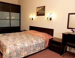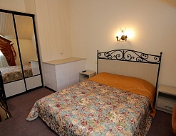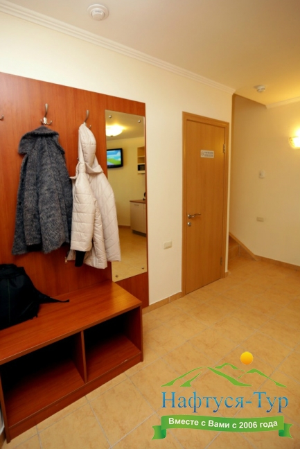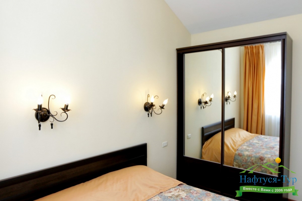 вешалка, зеркало, кресла, кровать двуспальная/ две полутороспальные кровати, прикроватные тумбочки, стол, столик журнальный, стул, шкаф