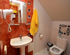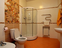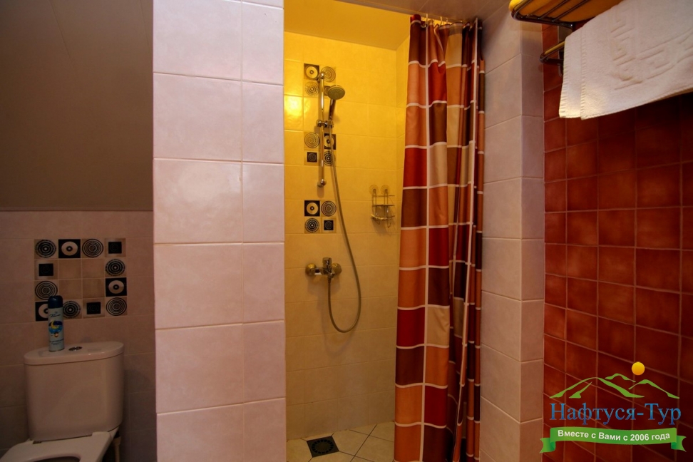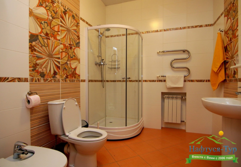 биде, с душевой кабиной, тапочки, туалетные принадлежности, фен, халат