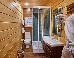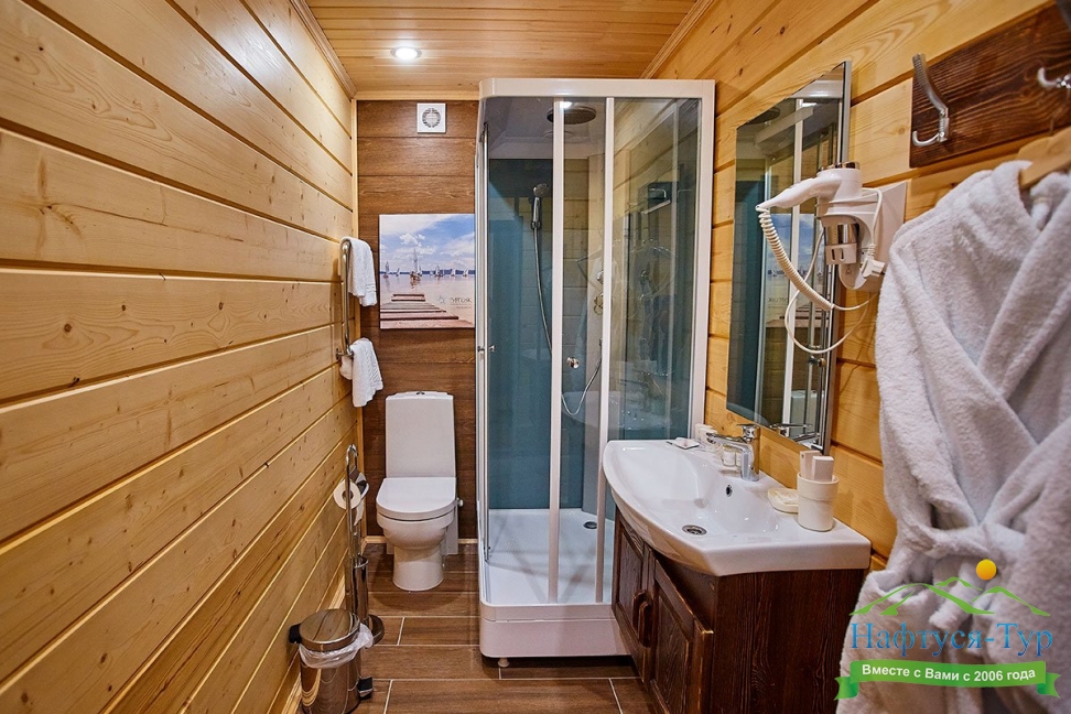 с ванной или душевой кабиной, тапочки, туалетные принадлежности, фен, халат