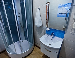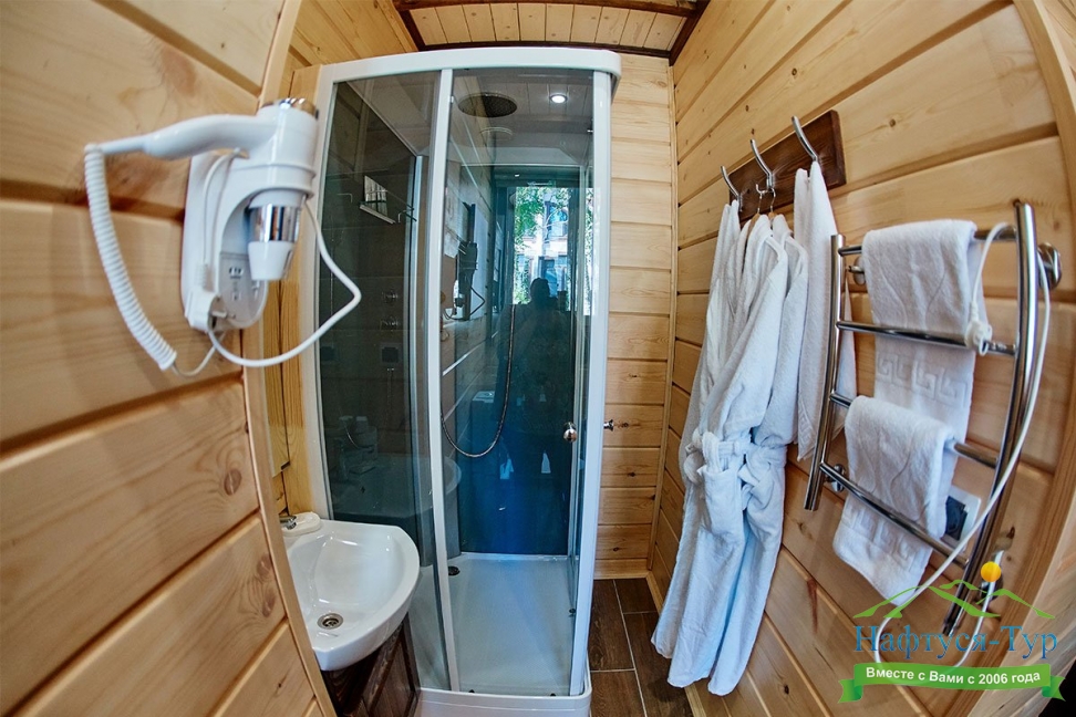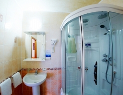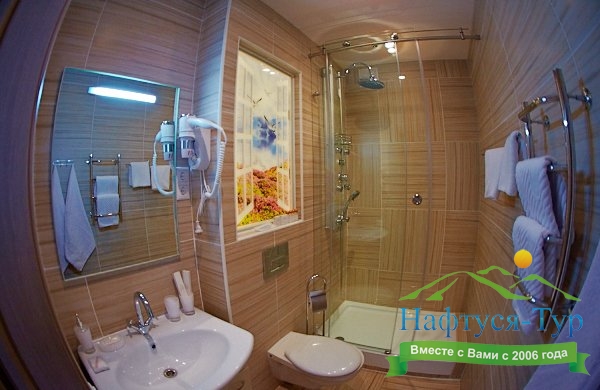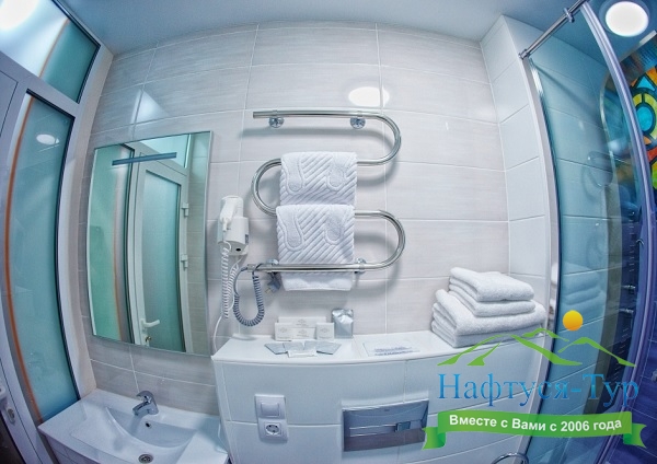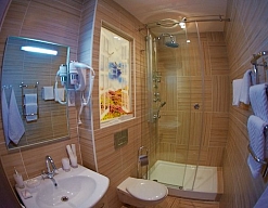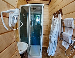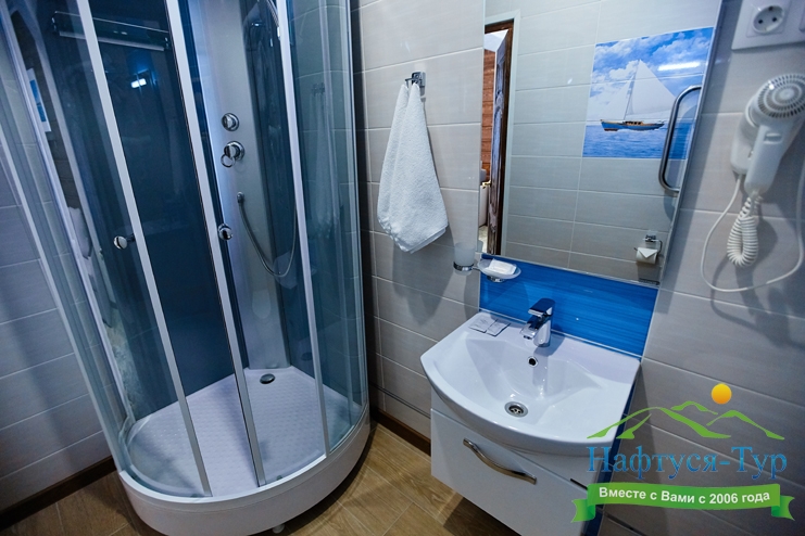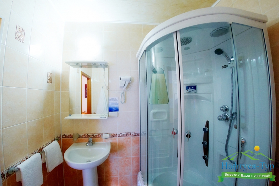с душевой кабиной, туалетные принадлежности, фен