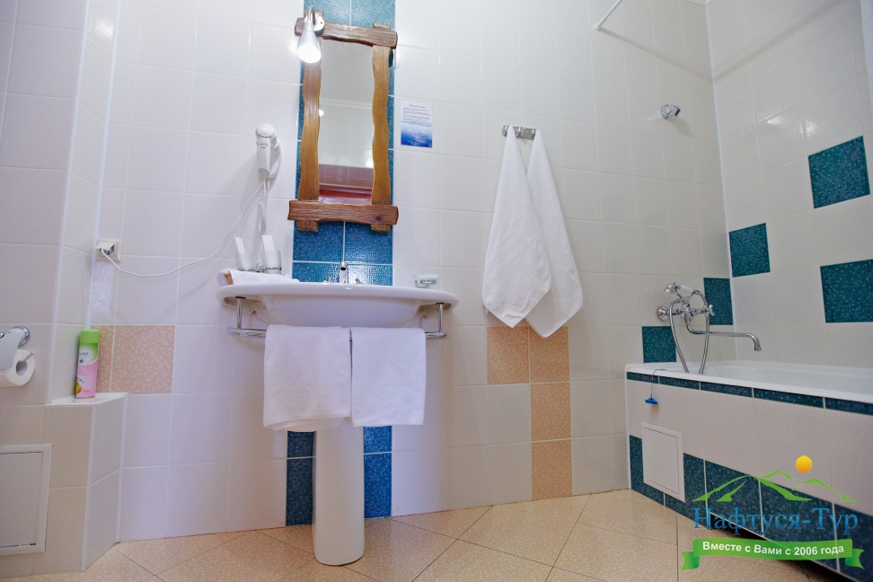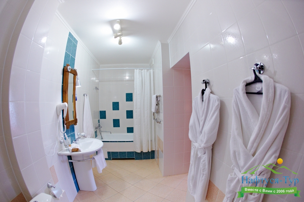 с ванной, туалетные принадлежности, фен, халат