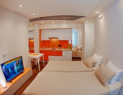 мини-холодильник, набор посуды, телевизор, телефон