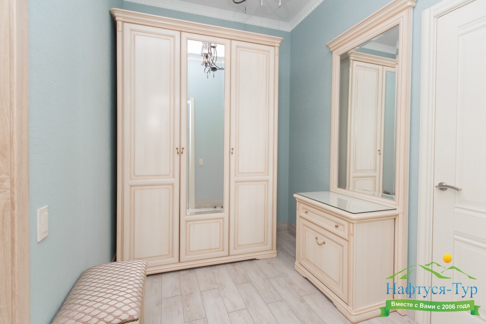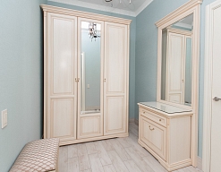 вешалка, зеркало, кресло, кровати односпальные /одна двуспальная кровать, прикроватные тумбочки, стол, шкаф