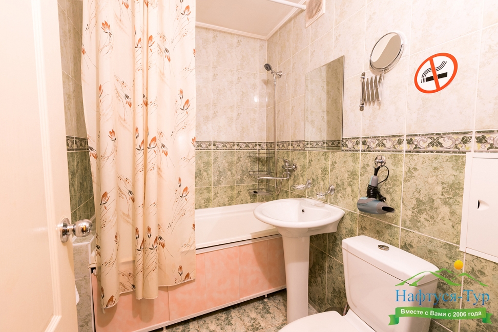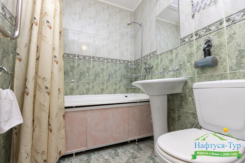 с душем или ванной, туалетные принадлежности, фен