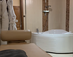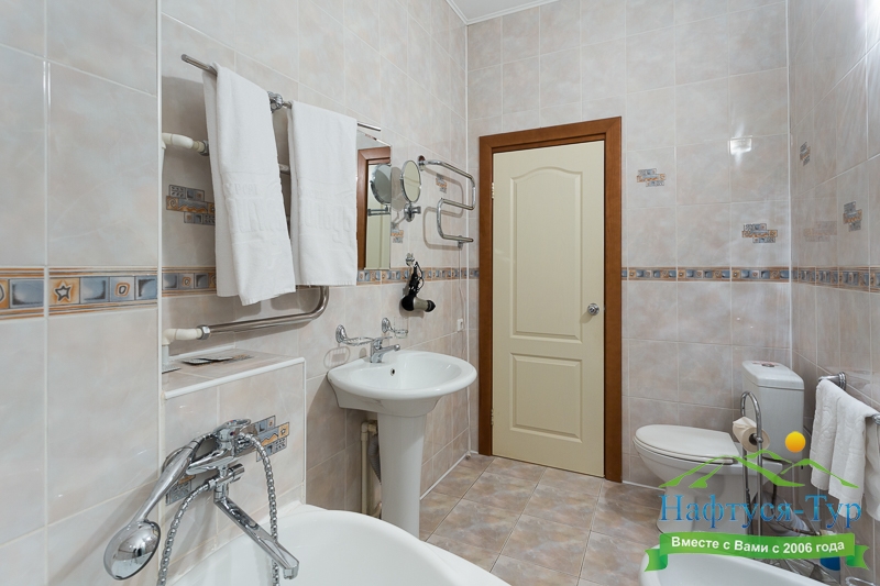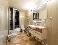 биде, сауна, с ванной и душевой кабиной, тапочки, туалетные принадлежности, фен, халат