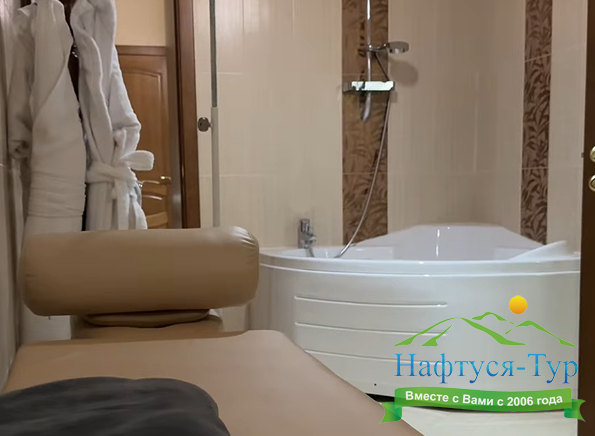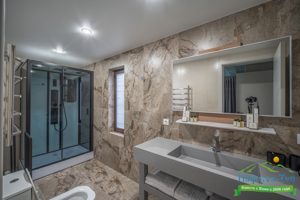2 санузла, с душевой кабиной, тапочки, туалетные принадлежности, фен, халат