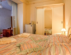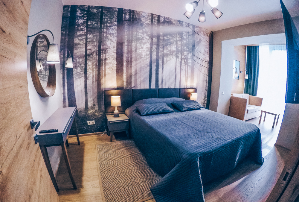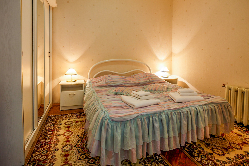 вешалка, диван раскладной, зеркало, кровать двуспальная, прикроватные тумбочки, стол, стулья, шкаф