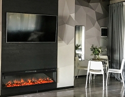 камин, мини-холодильник, телевизор, телефон, чайный набор посуды, электрочайник