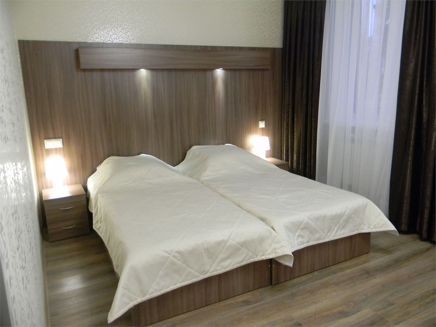 вешалка, диван, зеркало, кровати односпальные /одна двуспальная кровать, набор мягкой мебели, прикроватные тумбочки, стол, шкаф
