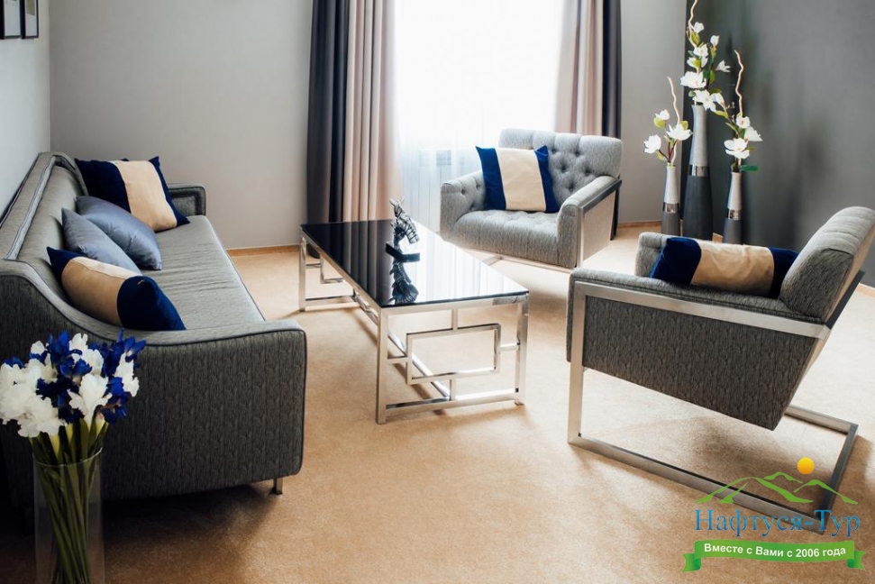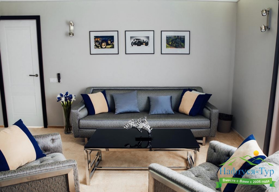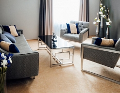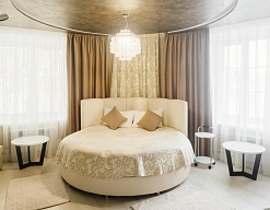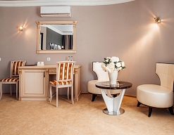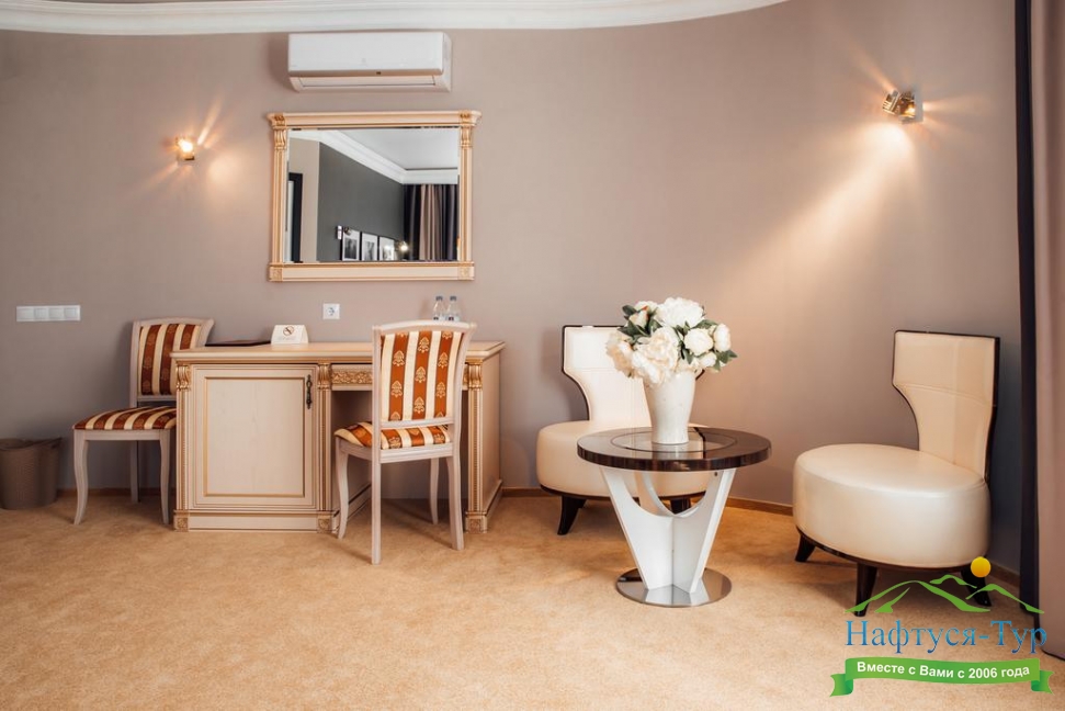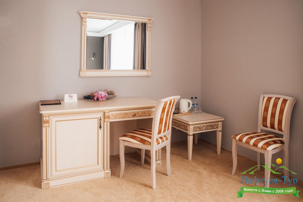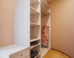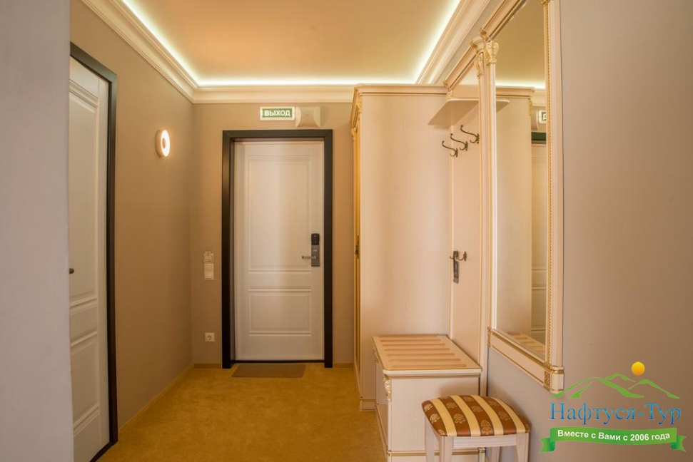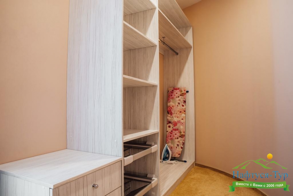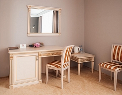 гардеробная, кровать двуспальная, набор мягкой мебели, прикроватные тумбочки, стол, стул