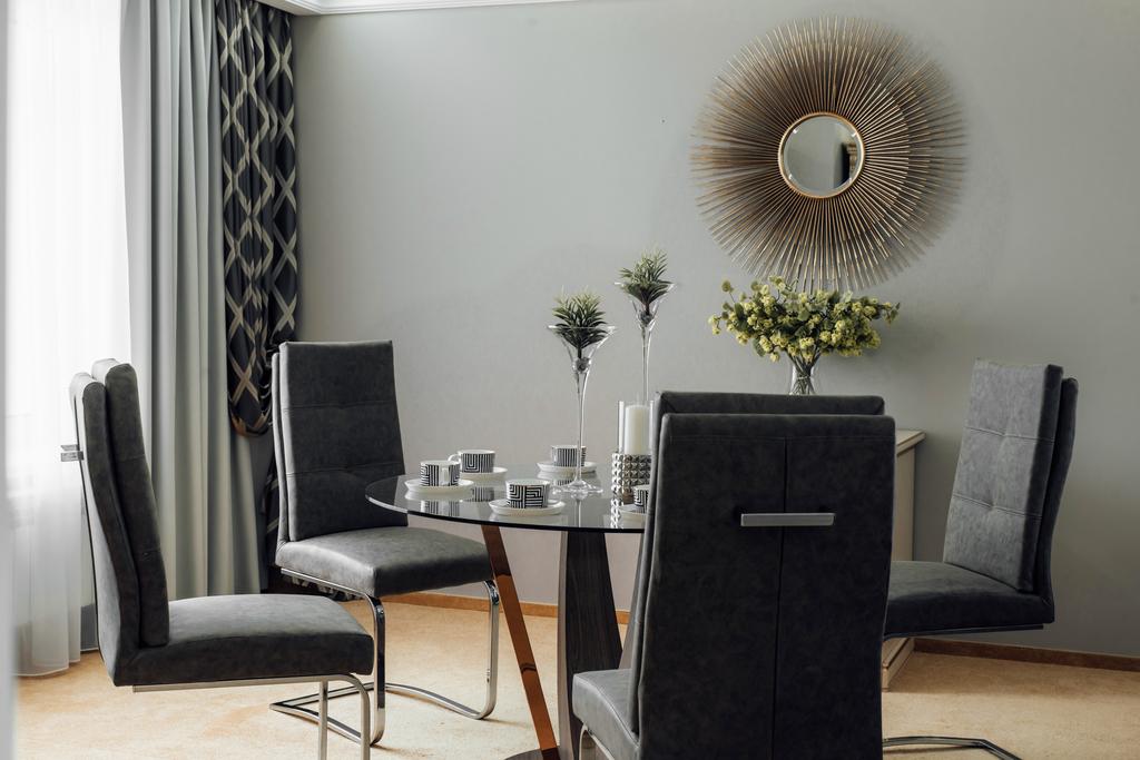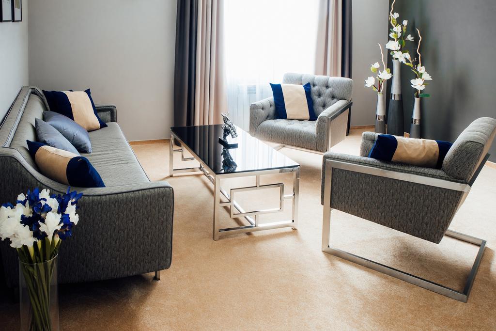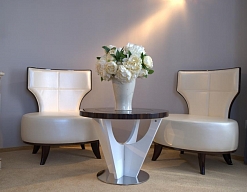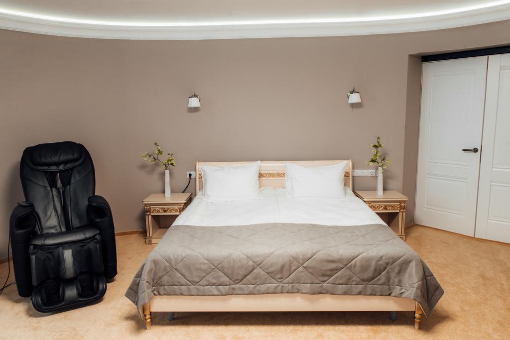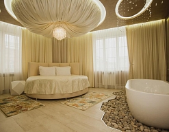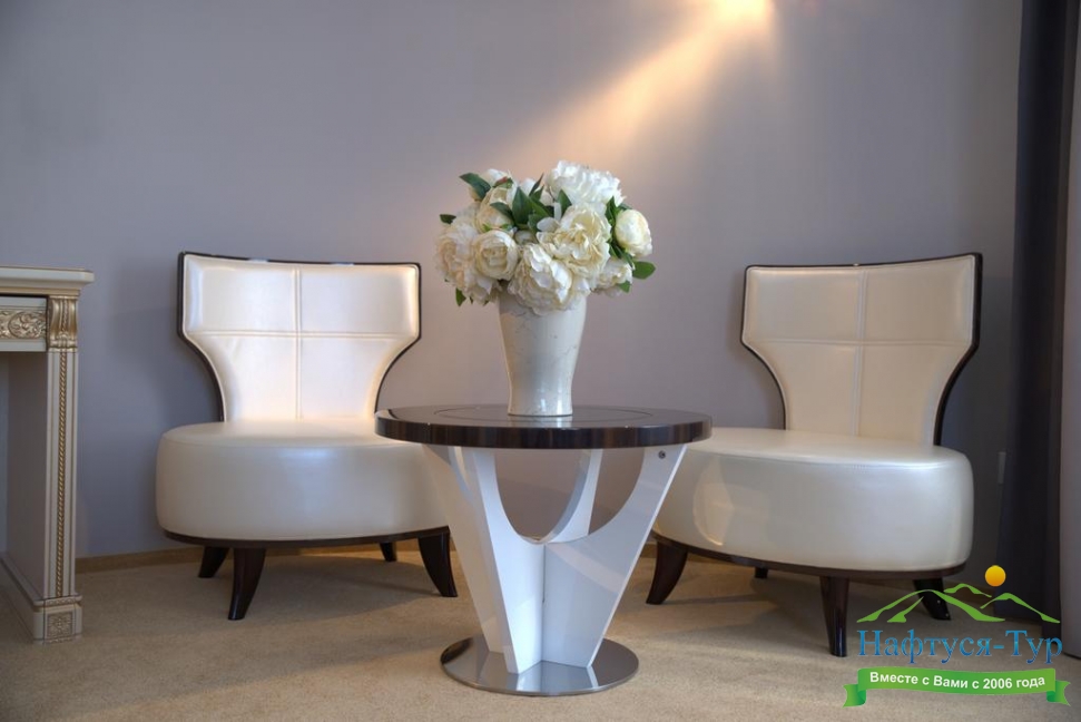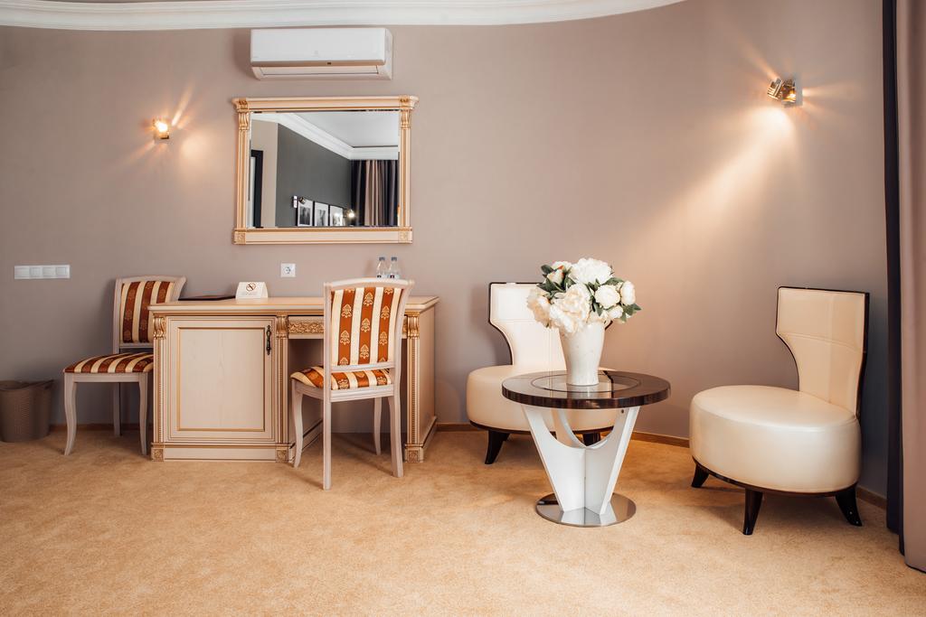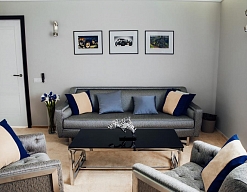 гардеробная, кровать двуспальная, набор мягкой мебели, прикроватные тумбочки, стол, стул