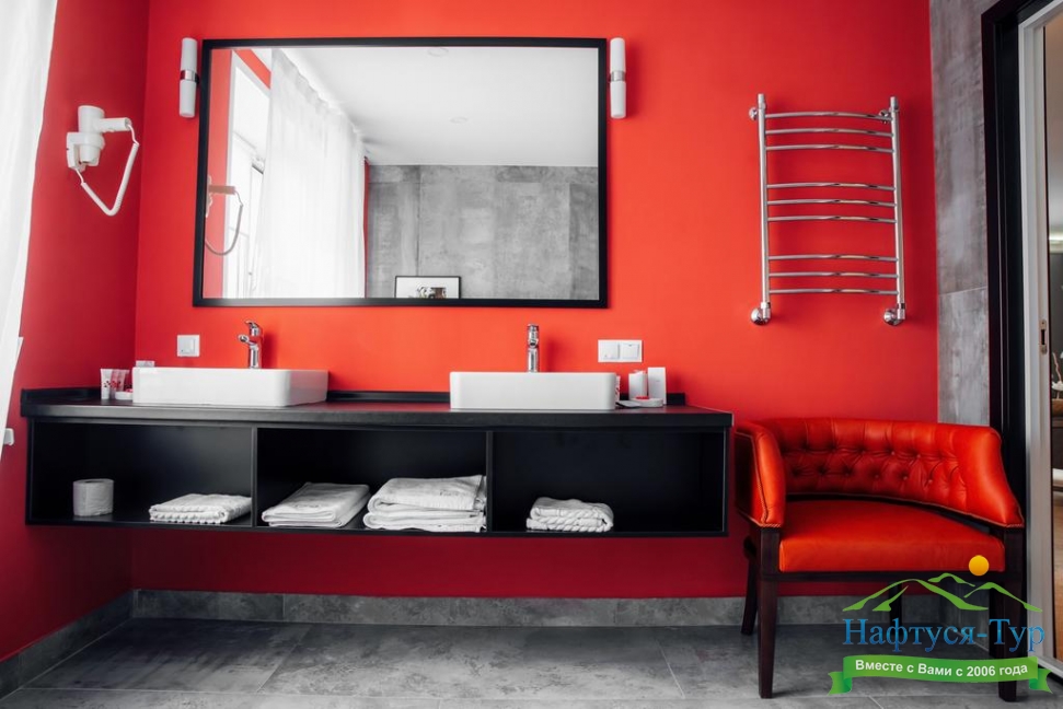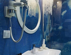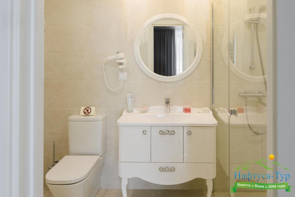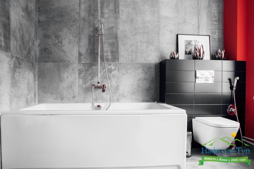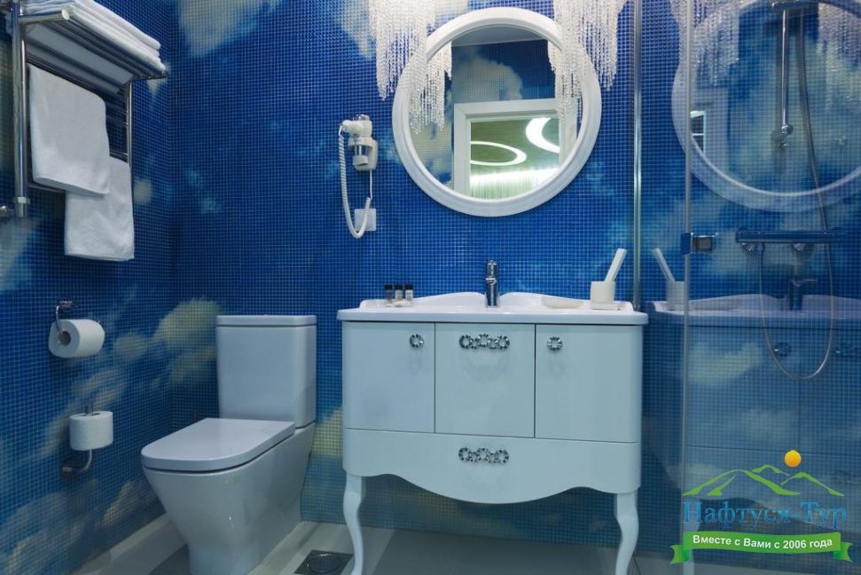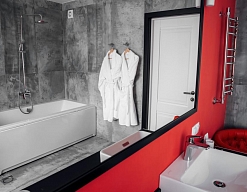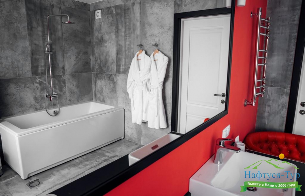 с ванной, тапочки, туалетные принадлежности, фен, халат