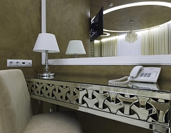гардеробная, кровать двуспальная, прикроватные тумбочки, стол, стул