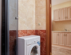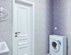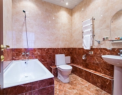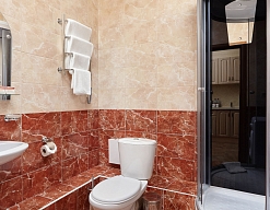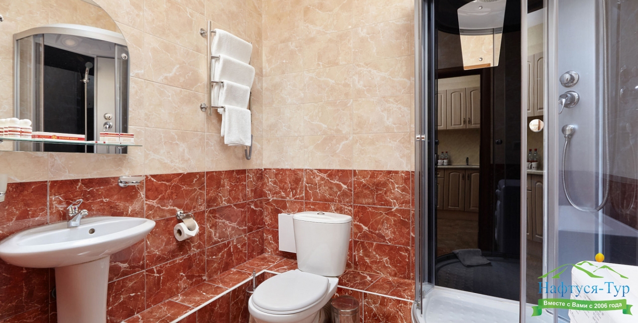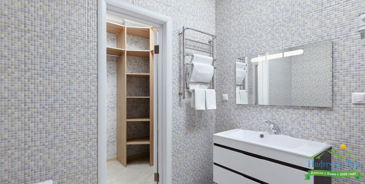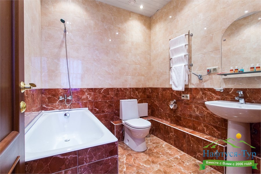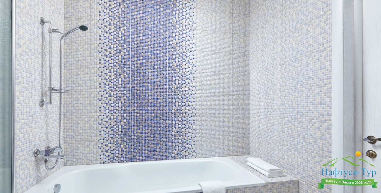 с ванной или душевой кабиной, тапочки, туалетные принадлежности, фен
