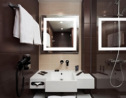 с ванной и душевой кабиной, тапочки, туалетные принадлежности, фен, халат