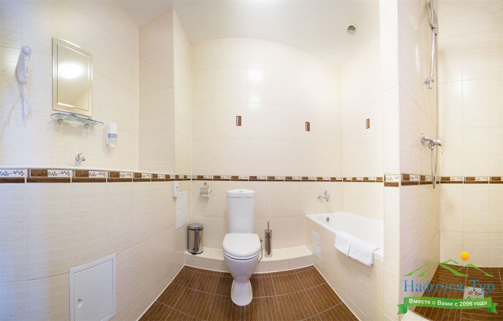 с ванной или душевой кабиной, туалетные принадлежности, фен