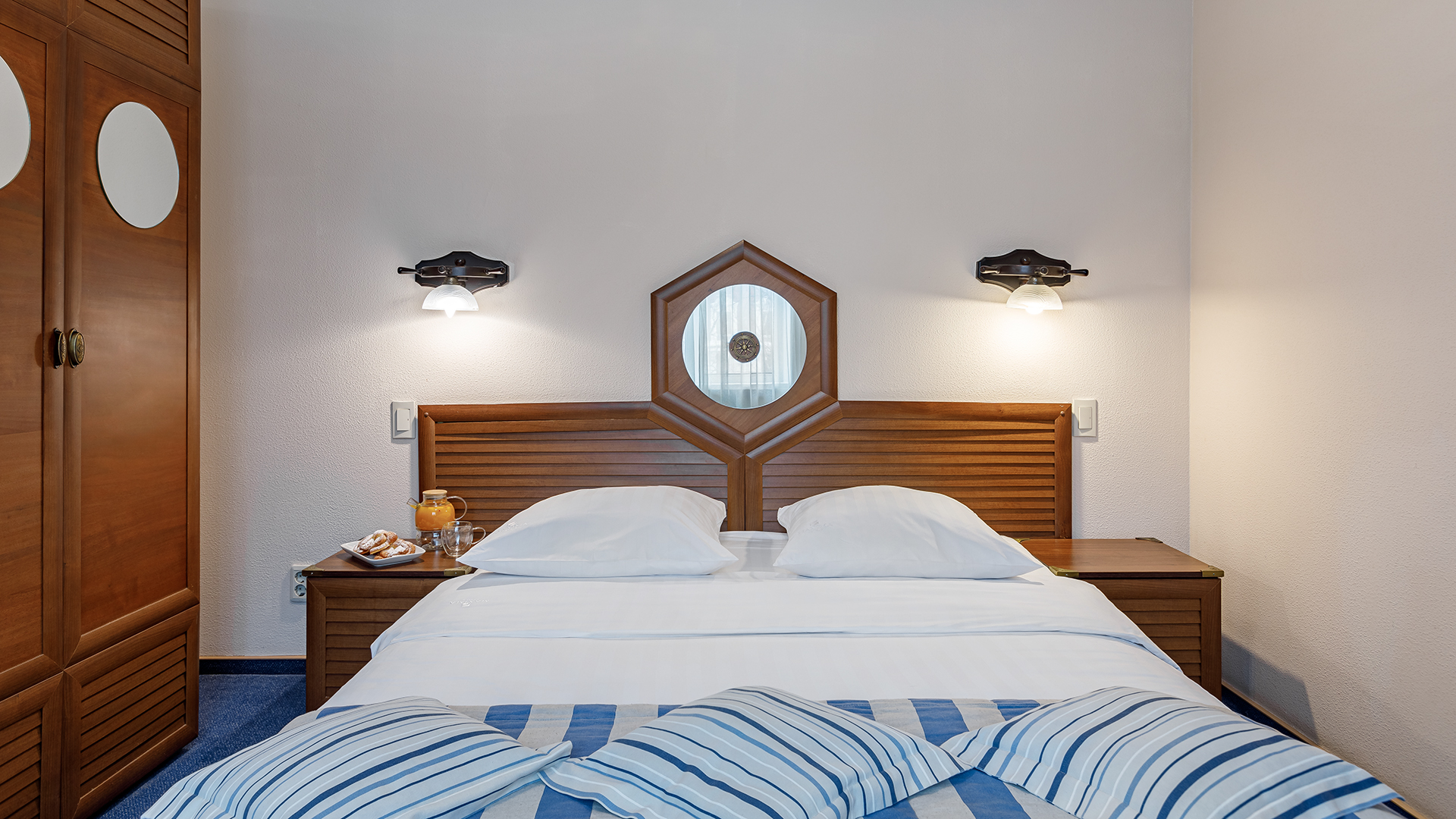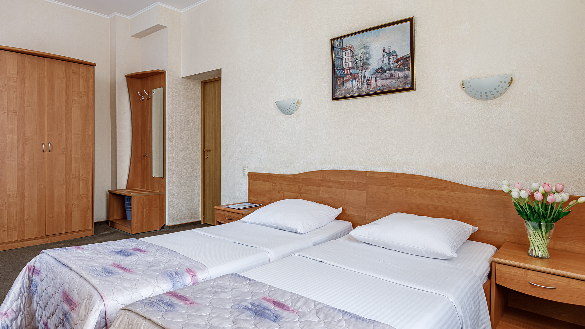 вешалка, зеркало, кровати односпальные, прикроватные тумбочки, стол, стул, шкаф