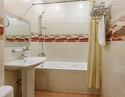 с ванной, тапочки, туалетные принадлежности, фен