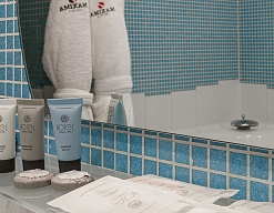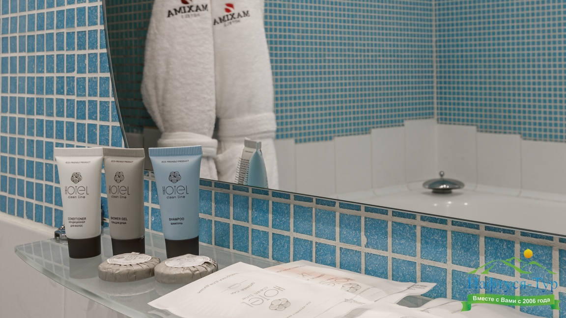 с ванной, тапочки, туалетные принадлежности, фен, халат