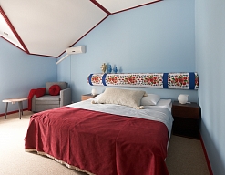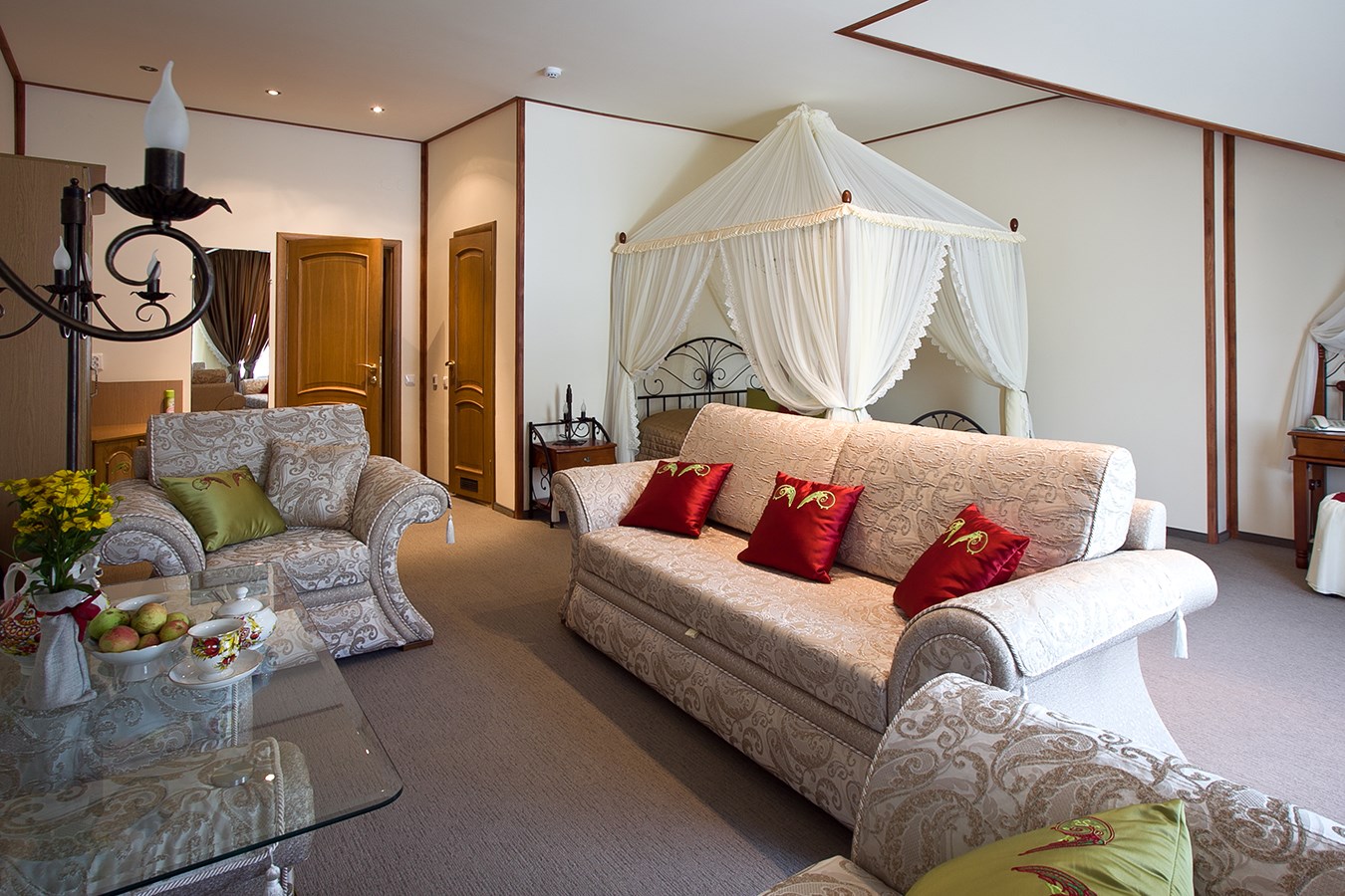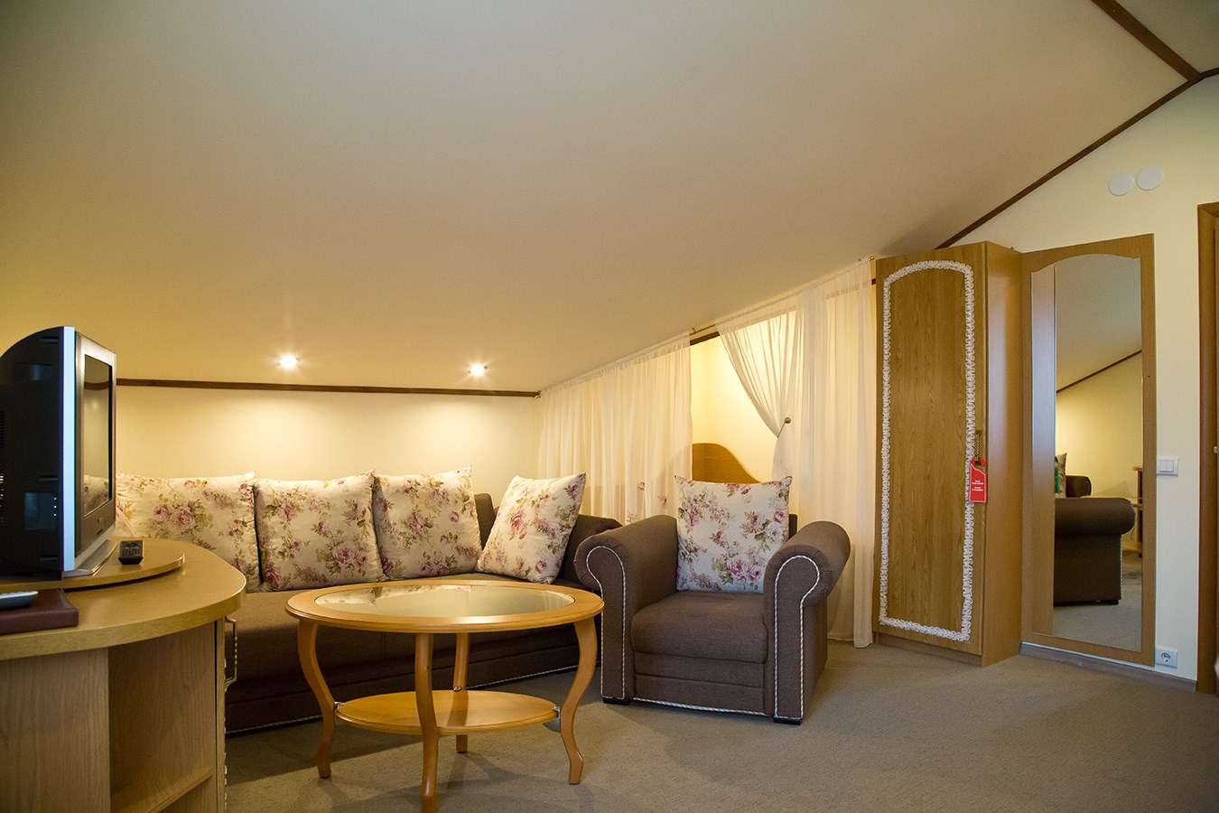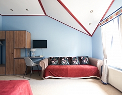 вешалка, диван, зеркало, кровати односпальные /одна двуспальная кровать, прикроватные тумбочки, стол, стулья, шкаф