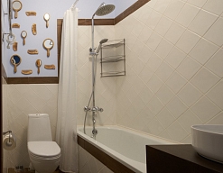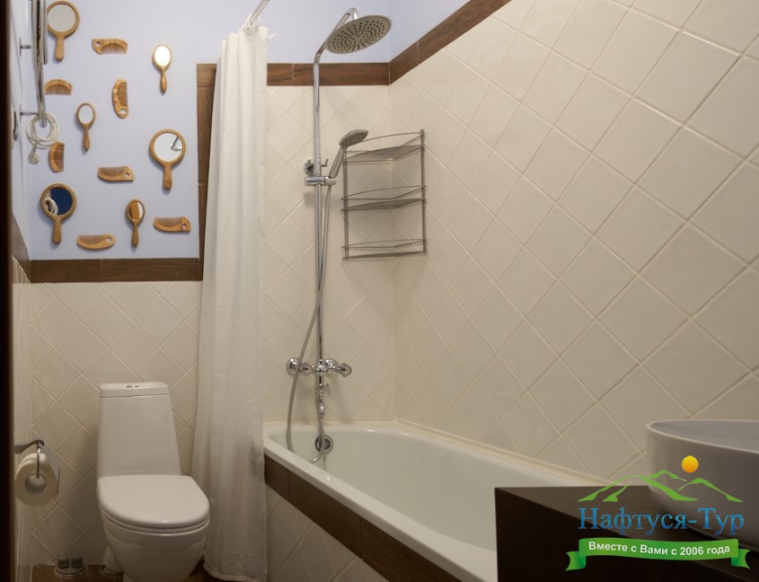 с душевой кабиной, туалетные принадлежности, фен
