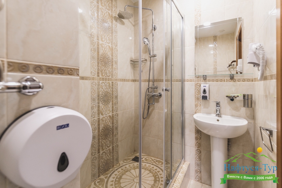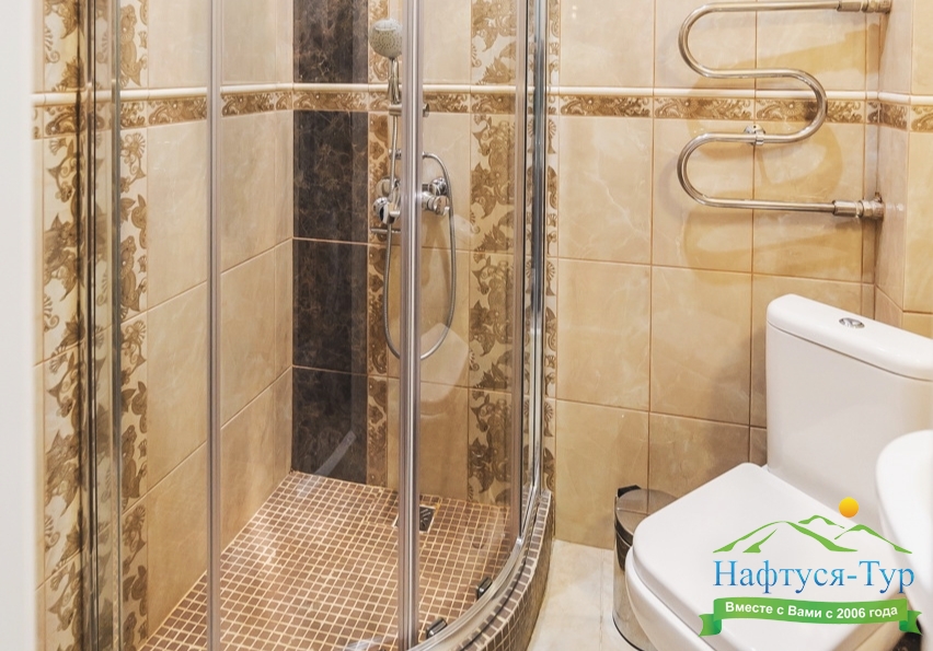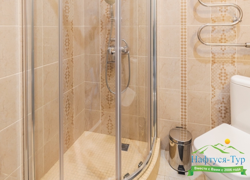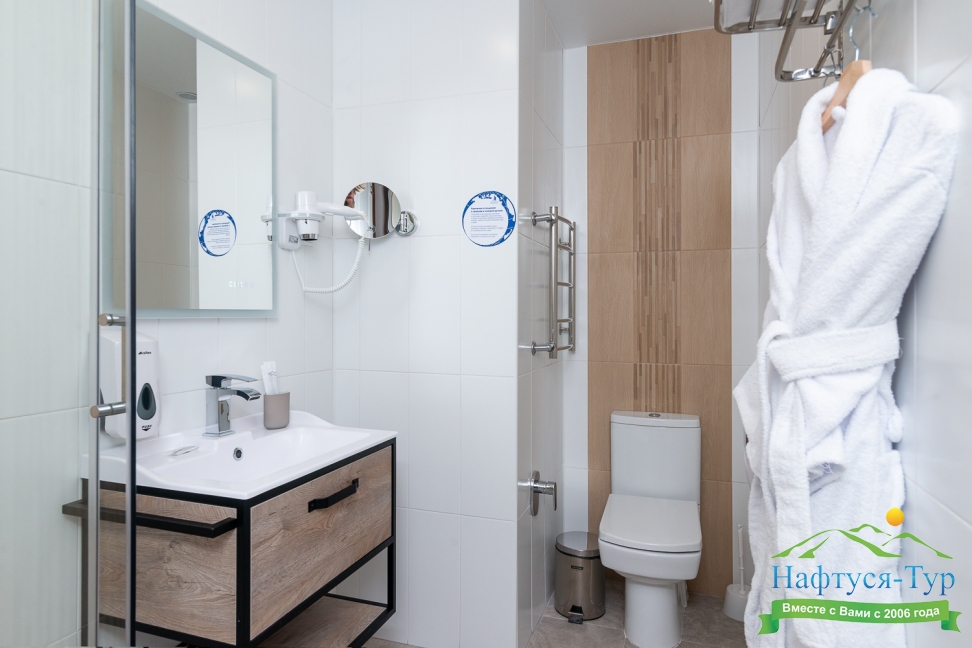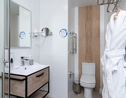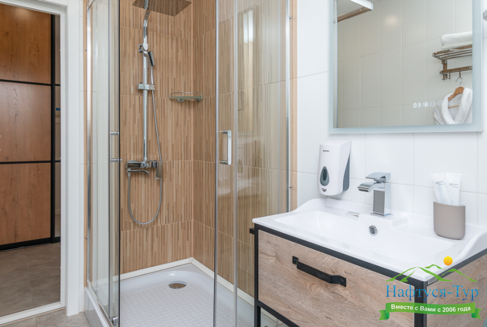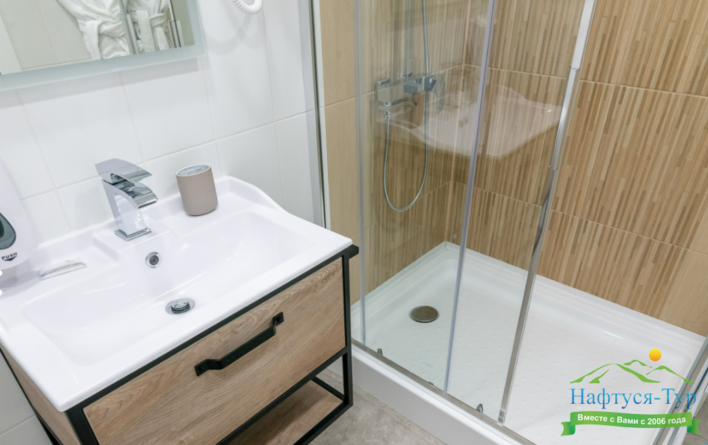с душевой кабиной, тапочки, туалетные принадлежности, фен, халат
