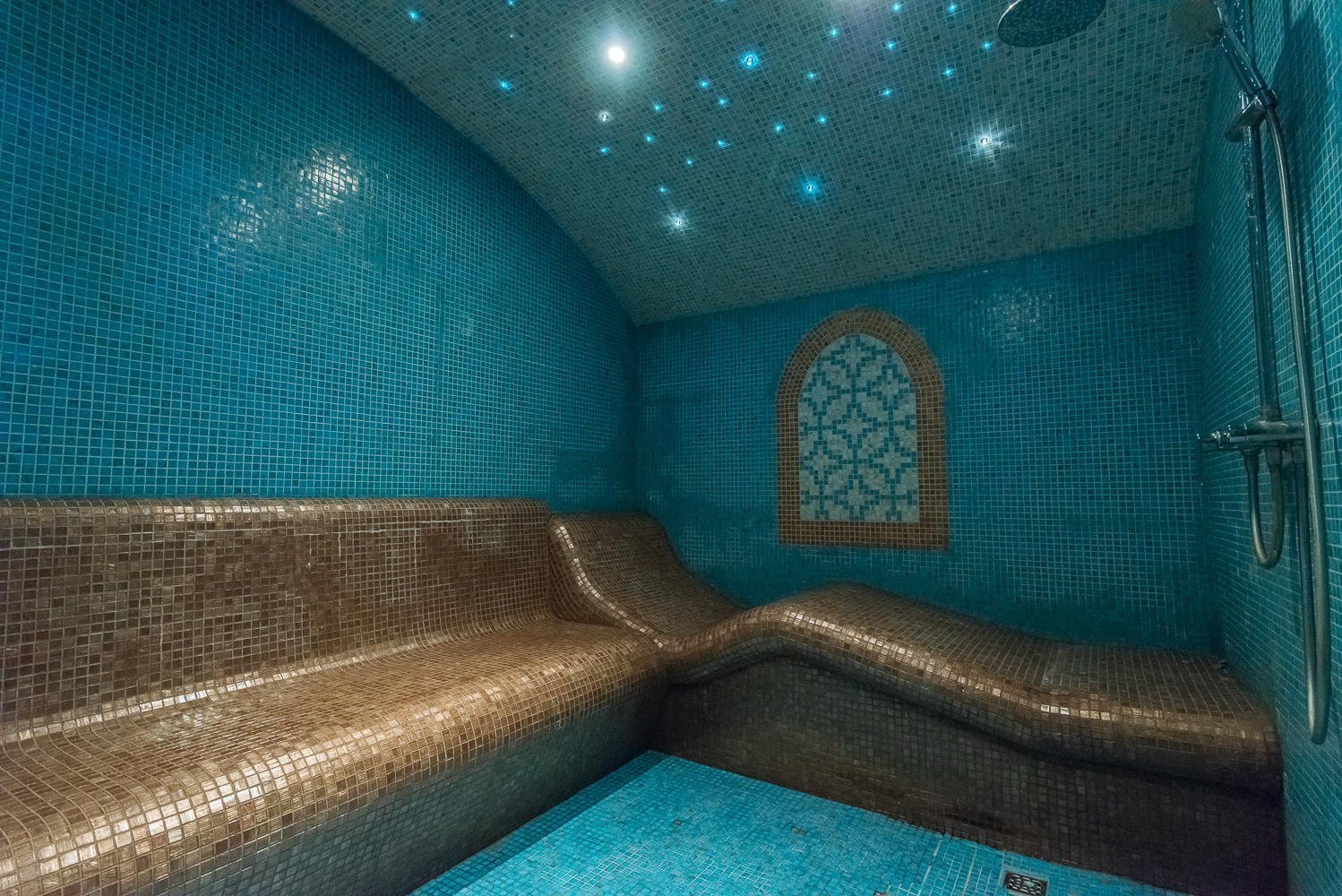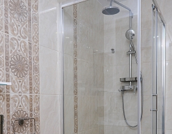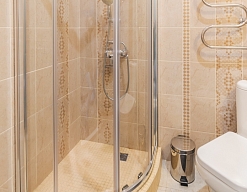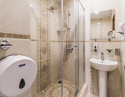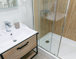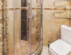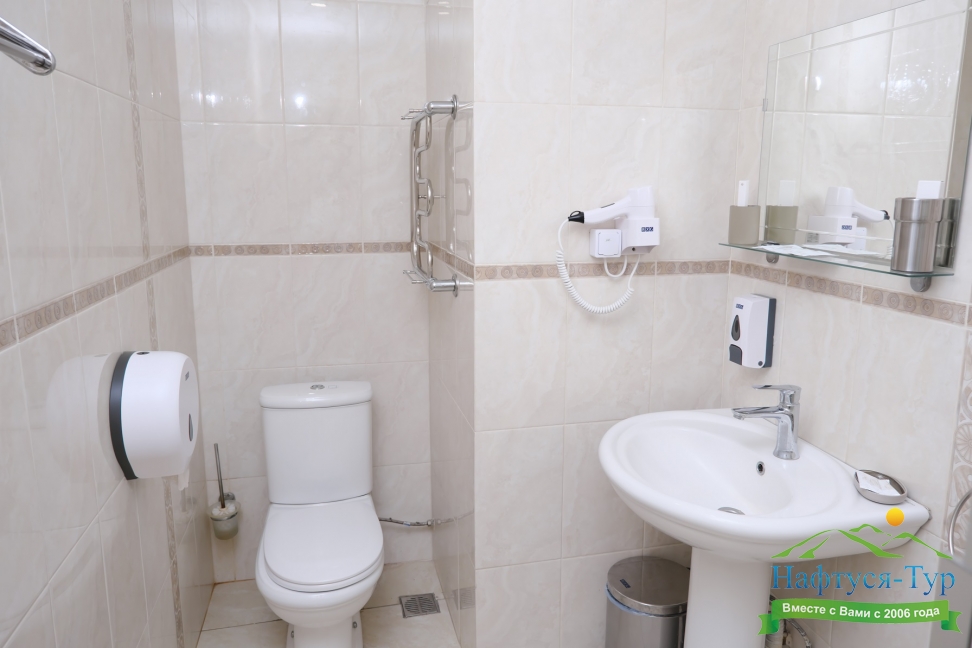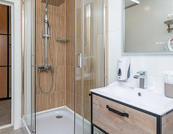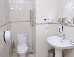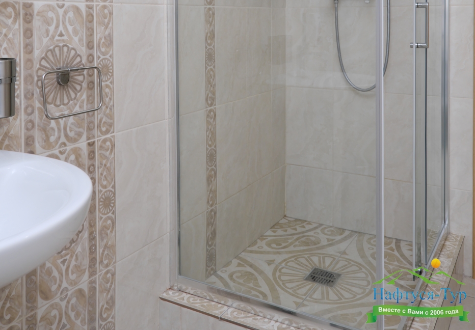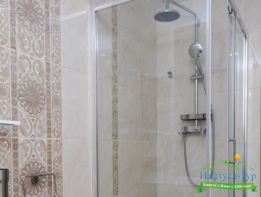 с душевой кабиной, тапочки, туалетные принадлежности, фен, халат
