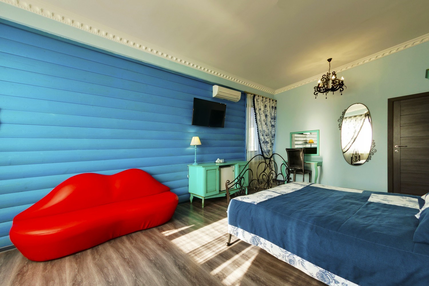 вешалка, зеркало, кресло, кровать двуспальная, прикроватные тумбочки, стол, шкаф